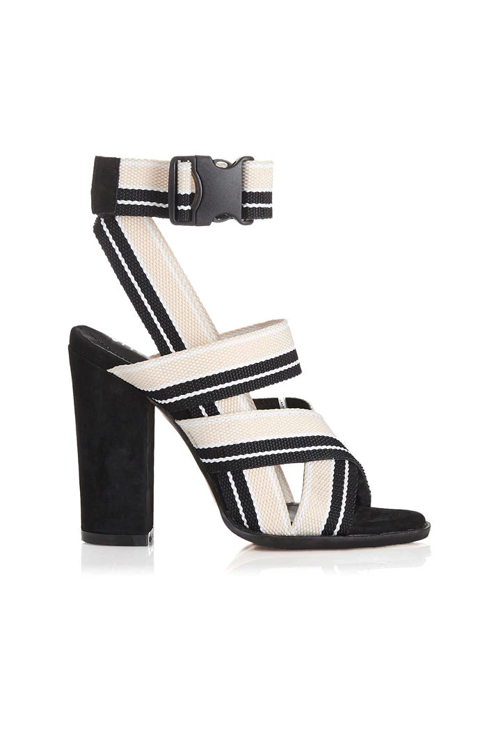 Aaliyah by Alias Mae in nude black combo. Sport luxe inspired canvas strap heels with clip lock closure at the ankle. Leather wrapped heel.