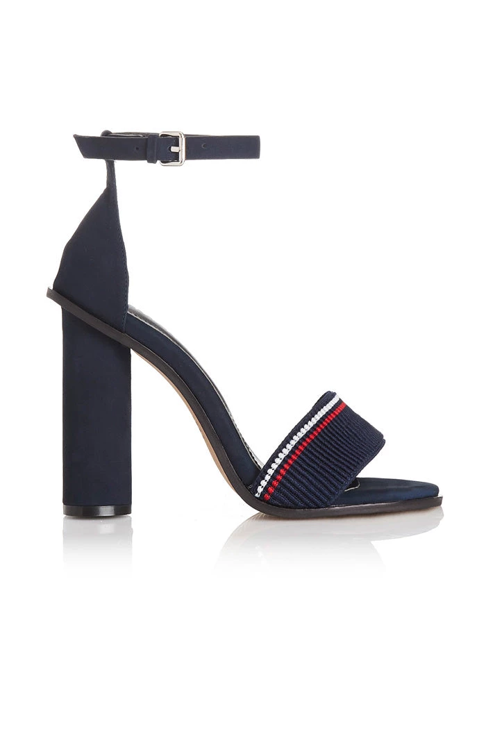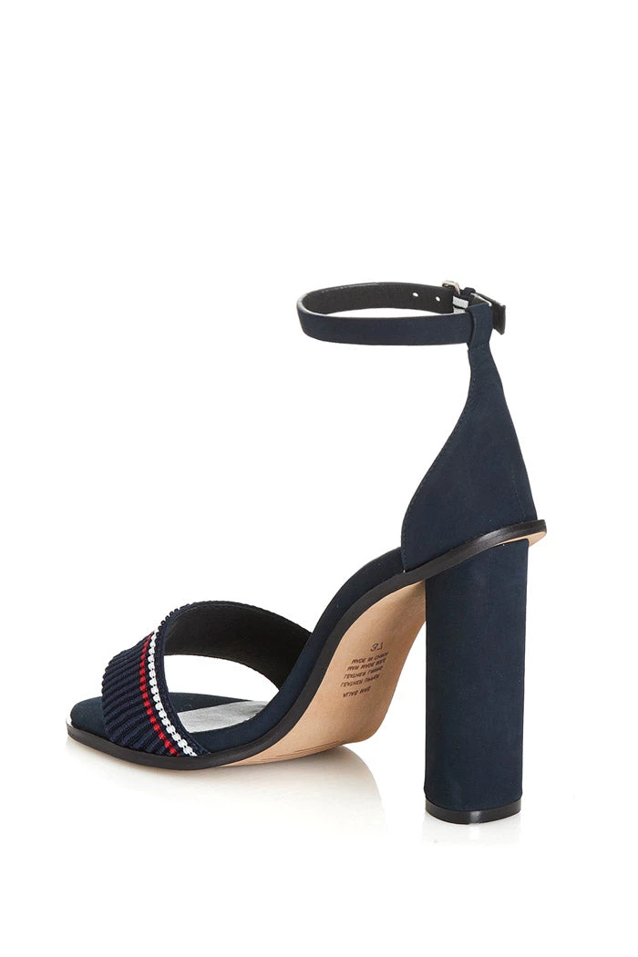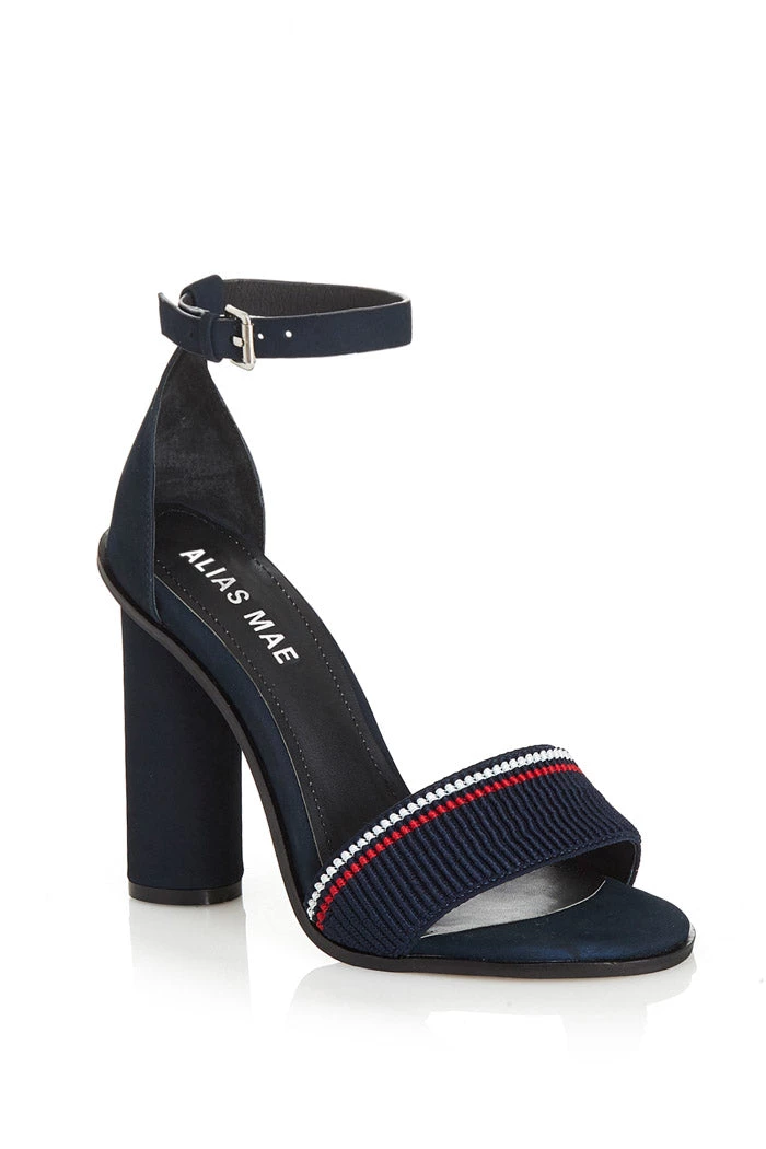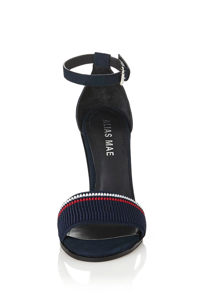 Ameleigh by Alias Mae in navy. Sleek sport luxe inspired canvas strap heels with clip lock closure at the ankle. Leather wrapped heel.