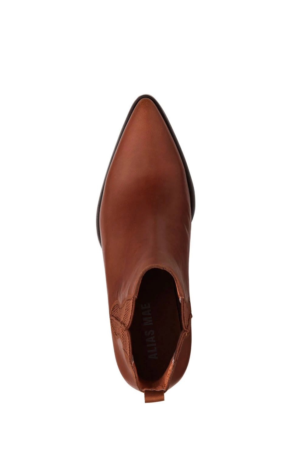 Stella by Alias Mae in tan burnished leather. A powerful pair that takes its cue from classic styles, fusing a razor-sharp pointed toe with a streamlined Chelsea silhouette. Finished with elasticised knit panels for ease slipping them on and off – the pair is set to remain front and centre in your wardrobe for years to come.