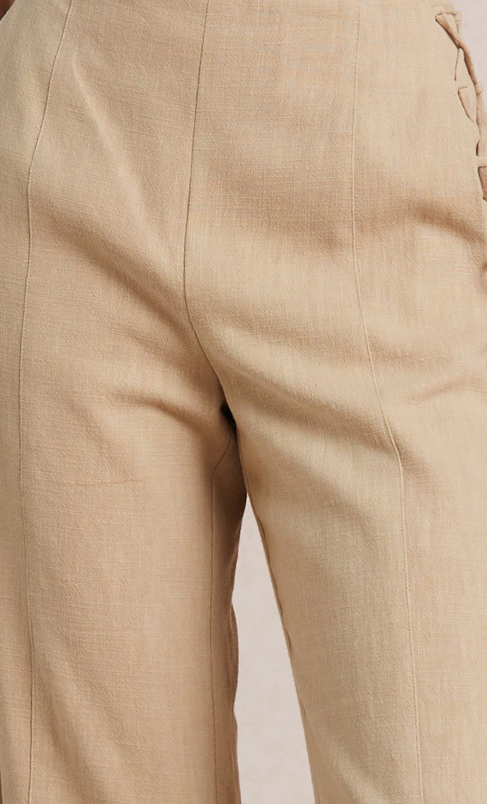 FIT:Â designed to be form fitted on the high waist with a wide leg silhouette. Pants are accessed by an invisible back zip. Fabric offers no stretch to the fit.Â
