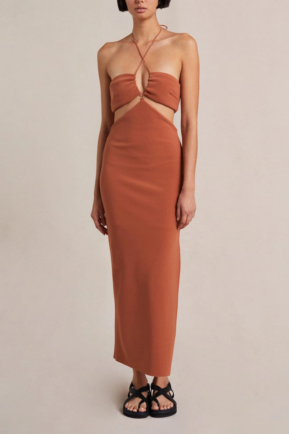 Combining alluring cut-outs and eye-catching details, the Alba Dress is a statement event wear style. Cut from a soft stretch knit fabric, the dress has a gathered bodice with a crossover halter neck, cut-outs at the under bust and a front gold O-ring accent.