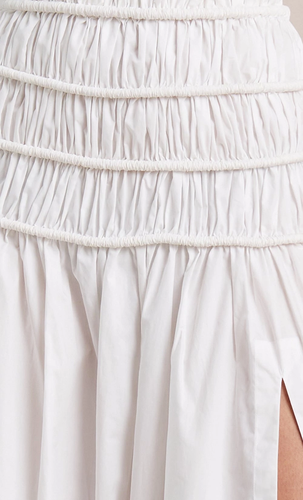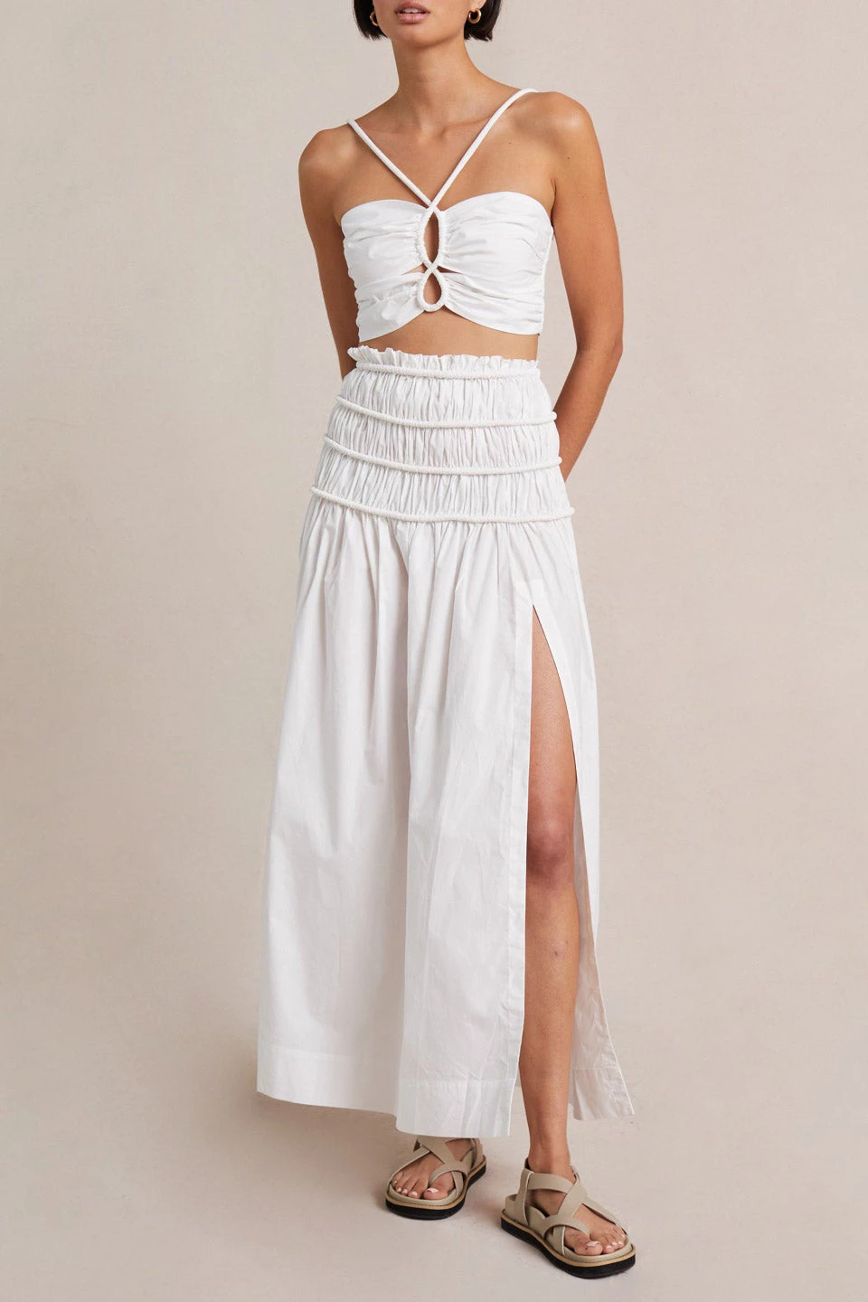 The Eli Maxi Skirt is an easy-to-wear high waisted cotton style with shirred detailing on the hips and waist, finished with a side split leg. Styled with the Eli Crop Top available here.