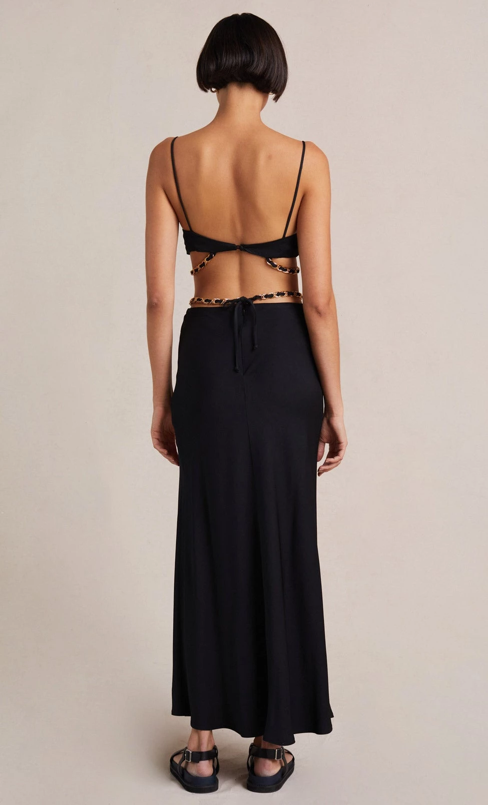 The Modern Romance Top is a statement crop cut from a bonded crepe fabric. The top features thin rouleau straps and gold chain hardware that is intertwined and draped around the twisted crop. Styled with the Modern Romance Maxi Skirt available here.