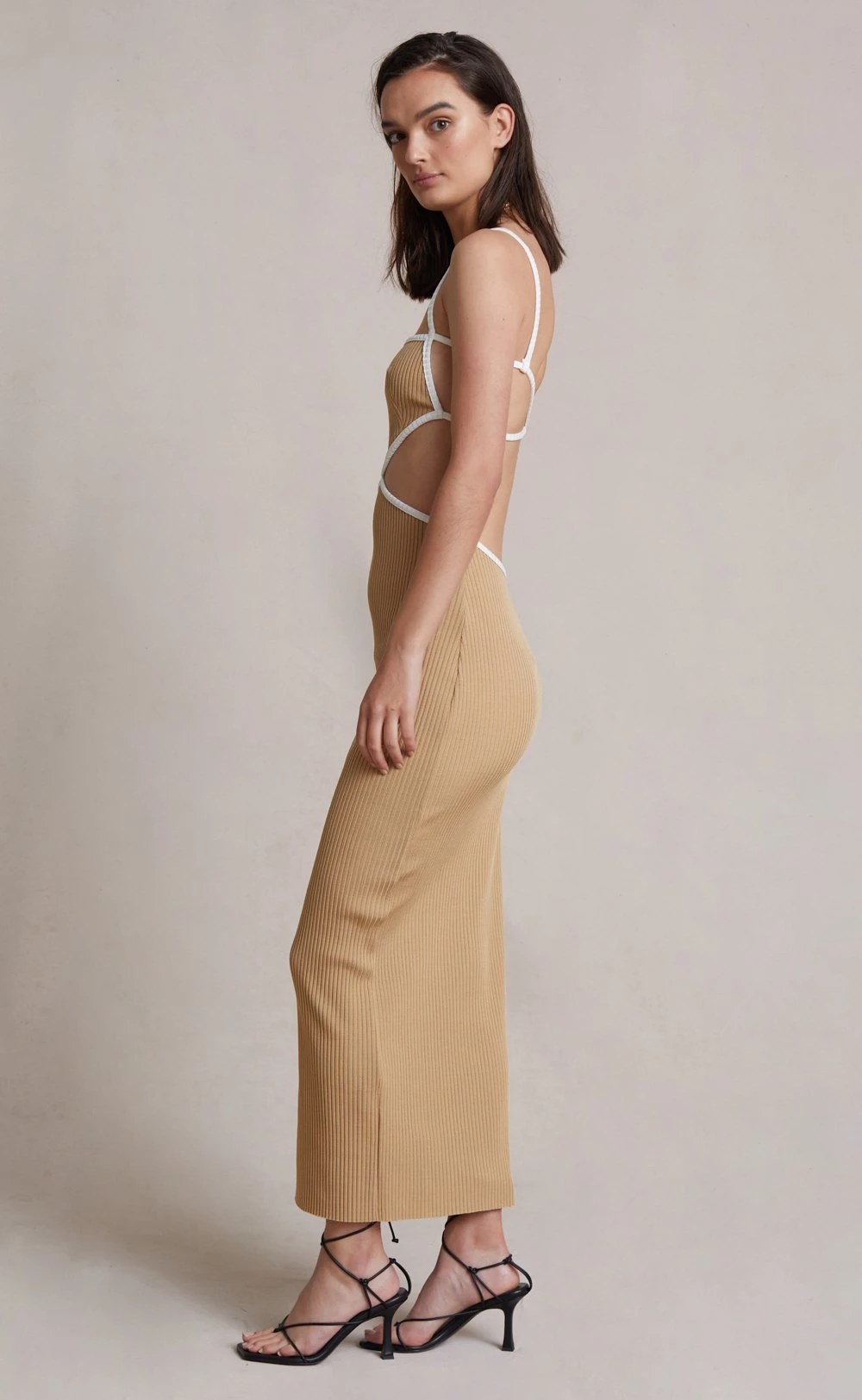 Fitted ribbed knit cut out midi with contrasting straps and lace up back detail. As worn by Shanina Shaik.