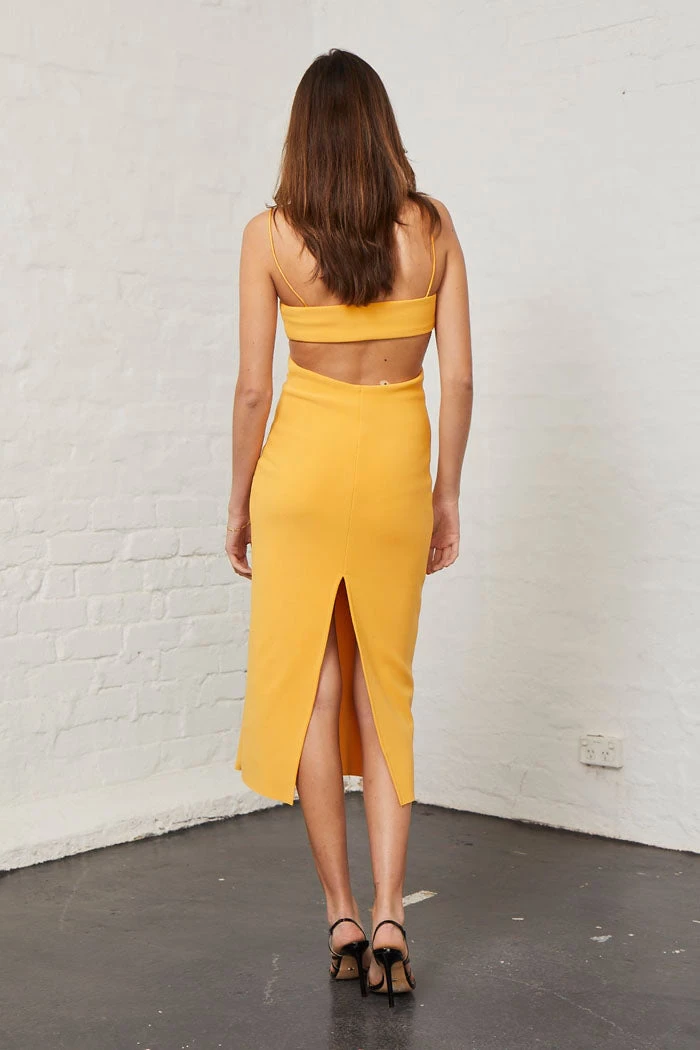 Elle Cut Out Midi by Bec and Bridge in Mango. Bonded crepe midi dress with cut out feature detail
