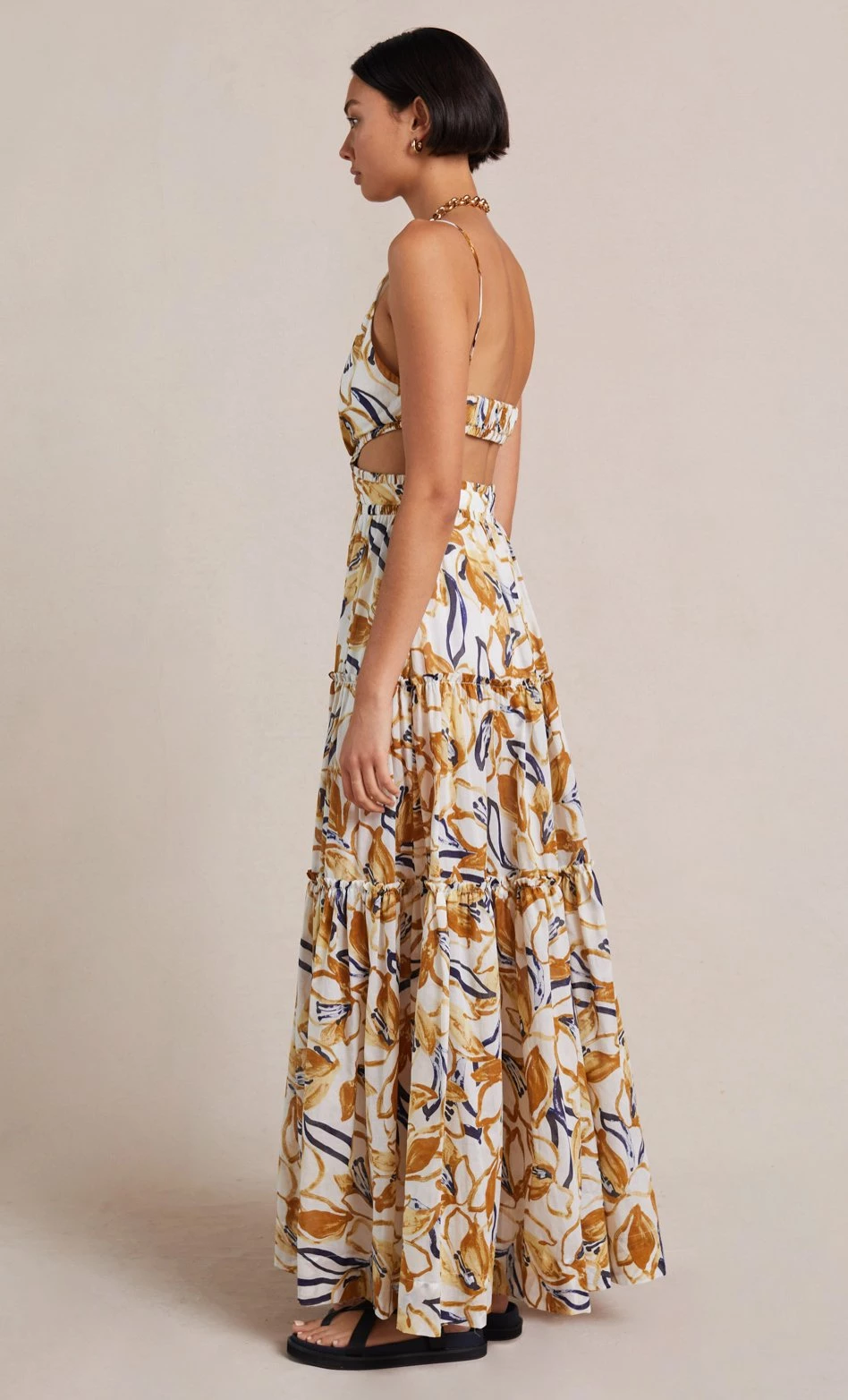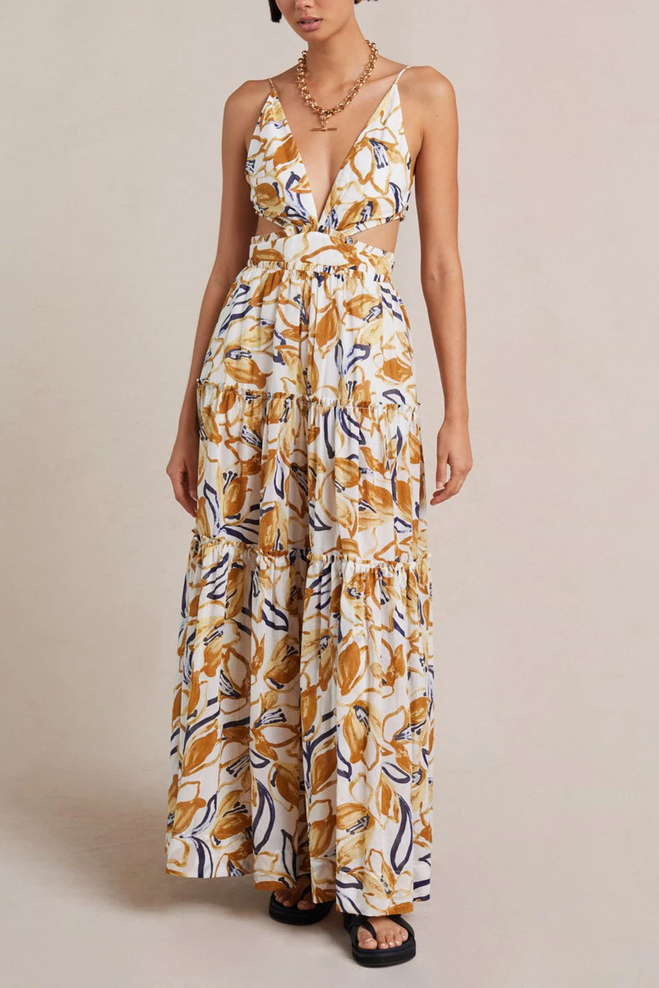 The Eugenie Maxi Dress is a plunging V-neckline statement style cut from a signature floral print cotton fabric. The maxi dress features side cut outs on the waist that wraps around to an open back. The maxi dress cinches in at the high waist before falling into a beautiful flowing tiered ankle length skirt.Â