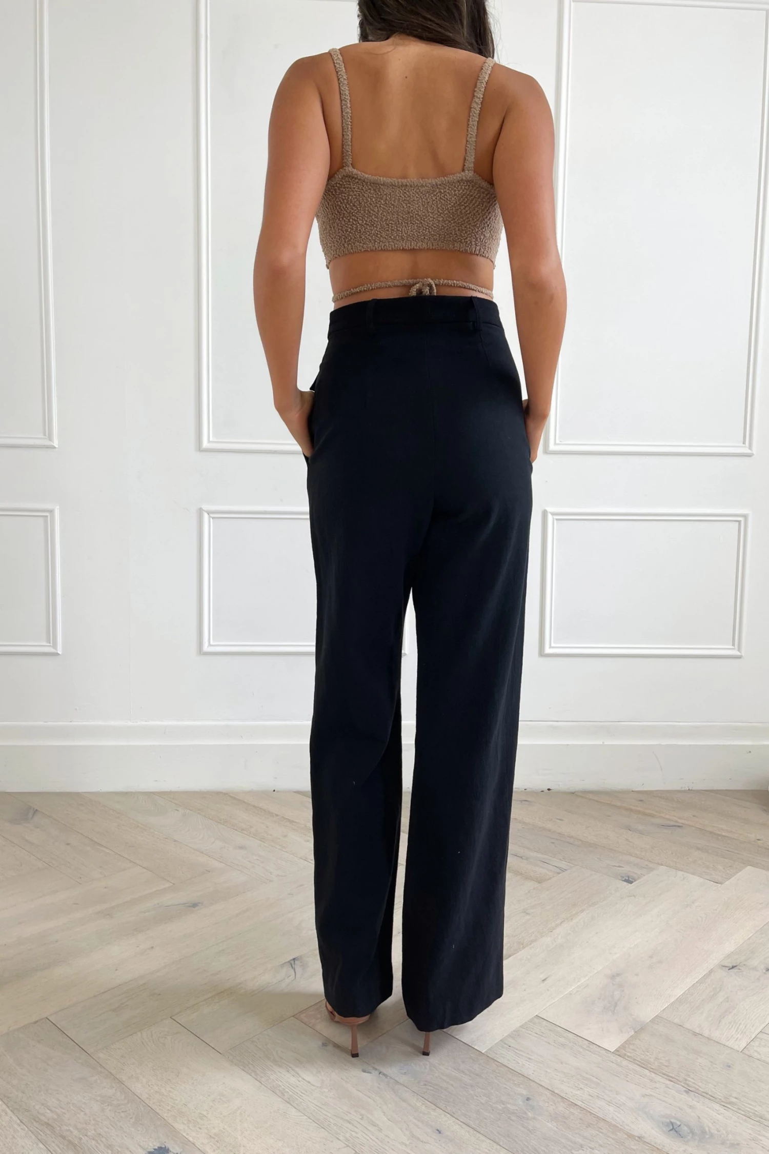 As worn by Hailey Bieber, the Harlow Pant is a flattering tailored pant that sits high at the waist and falls into a wide leg fit through the legs. Cut from an easy to wear cotton/ramie blend fabric, the pants are finished with front pockets and a concealed front zipper.Â