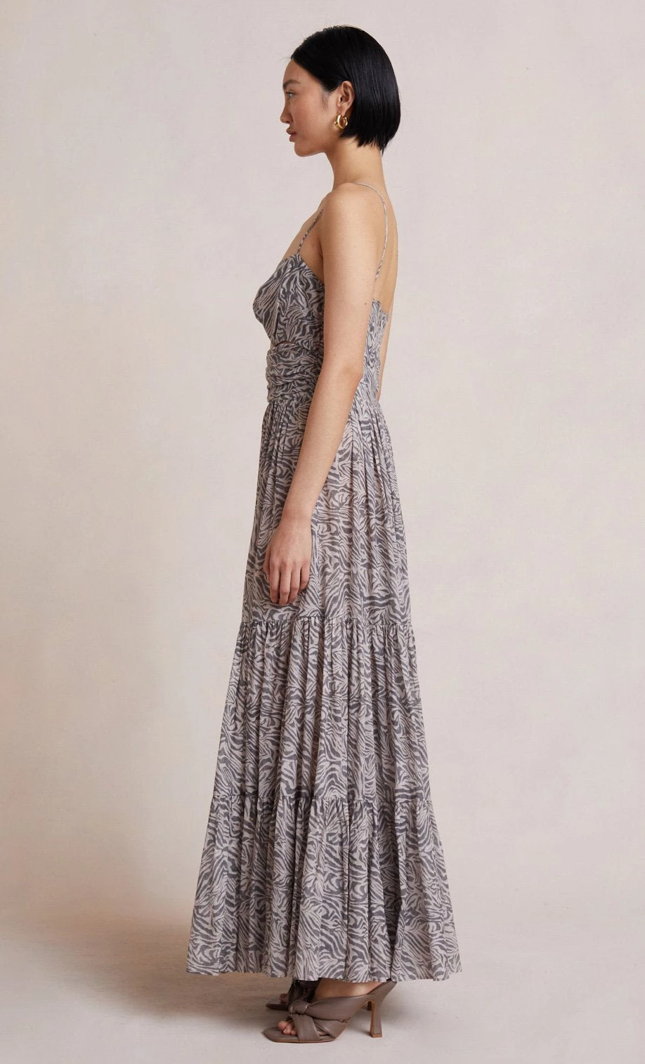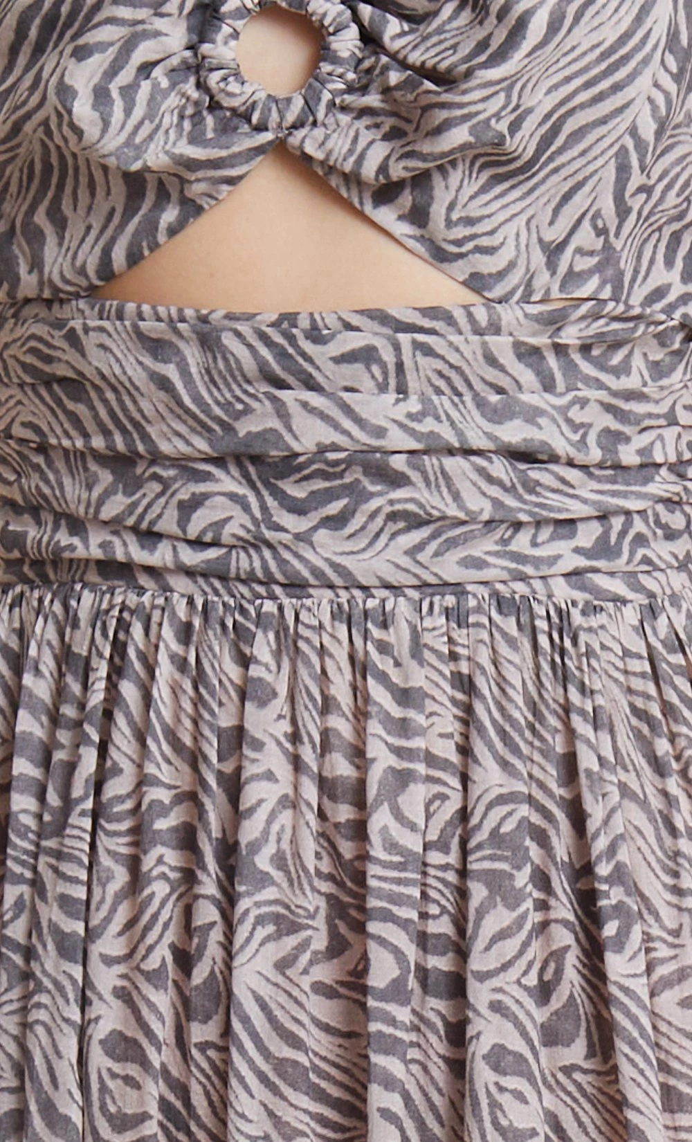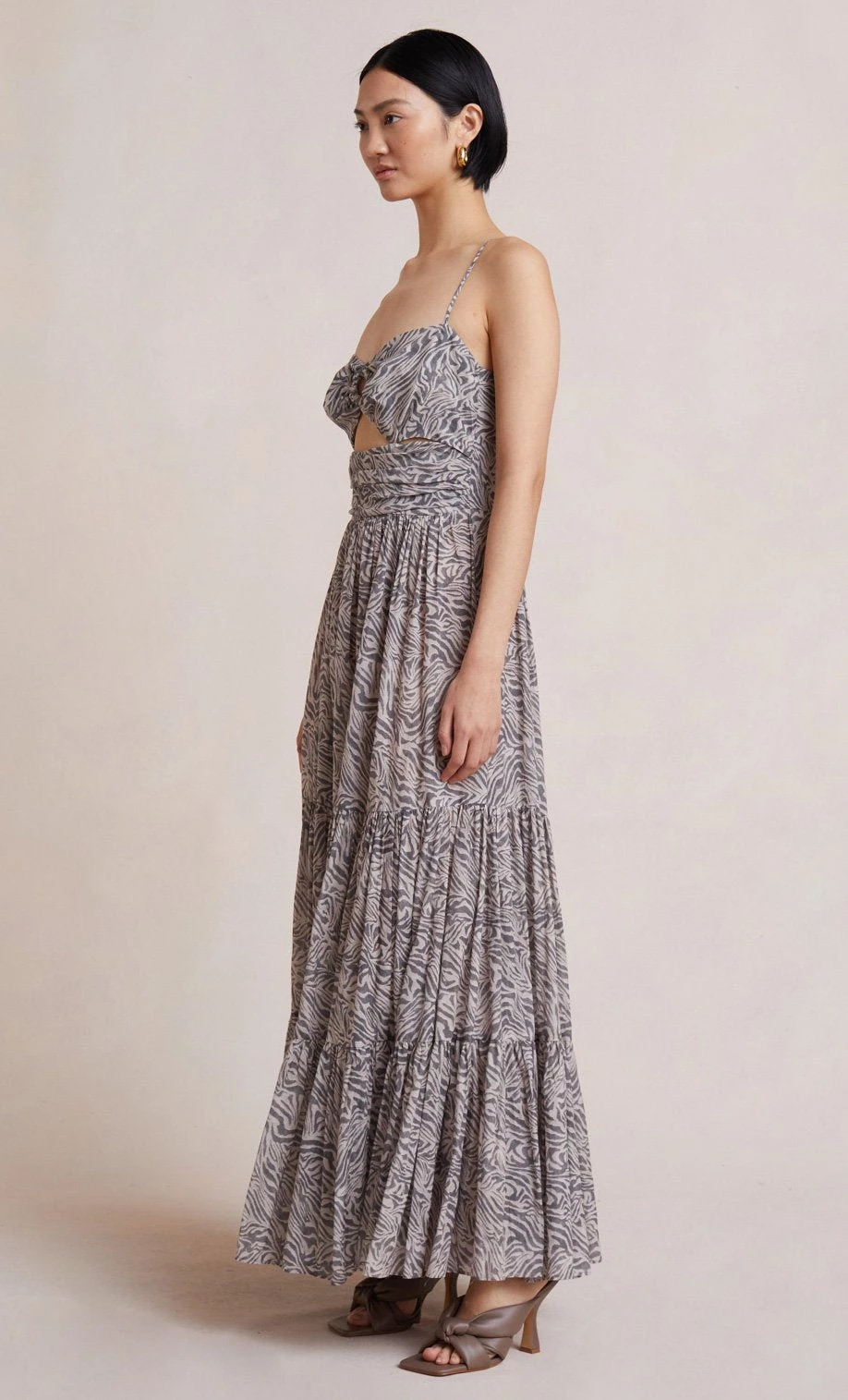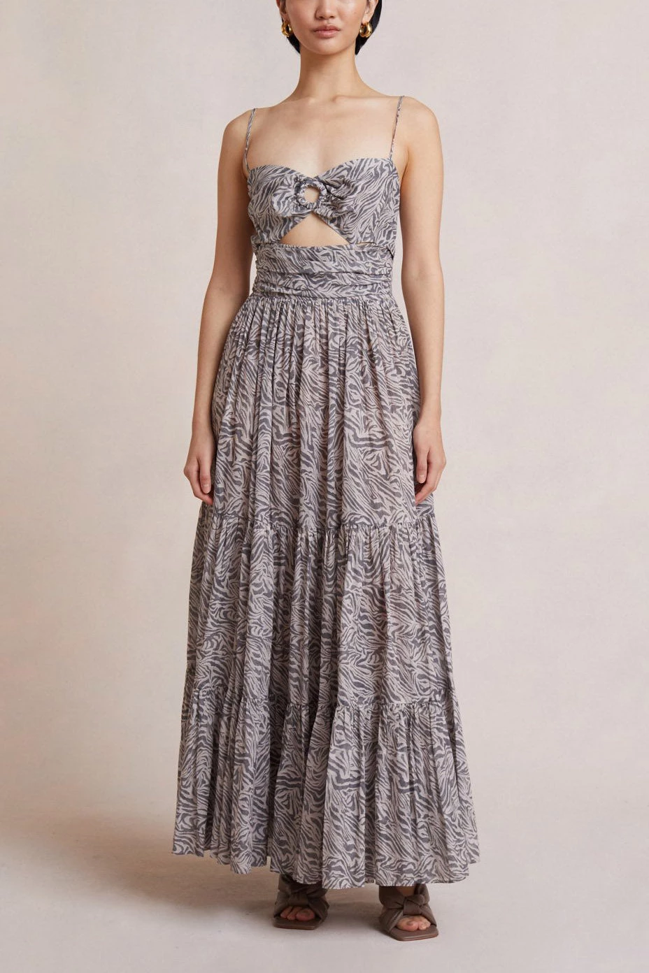 The Sahara Tier Maxi Dress is cut from a signature zebra print cotton fabric. The maxi dress features a sweetheart neckline finished with an O-ring detail at the fitted bust, rouleau straps, front cut out detail below the bust, and a pleated waist that flows into a tiered, gathered maxi skirt.Â