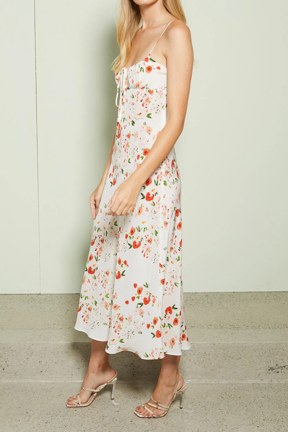 Floral printed silk midi dress with gathered bust panel