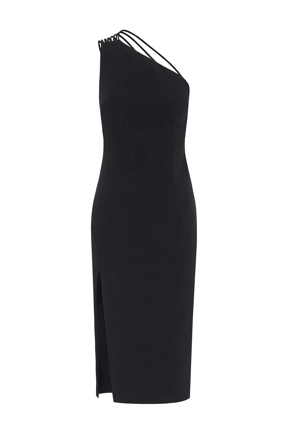 Chic and stylish, this ‘Sara Slice Asymmetric Midi Dress’ makes a statement. The dress is characterised by the asymmetrical neckline and roulette straps which fan from the front neckline to the scoop of the lower back. The dress fits slim to the body to compliment the feminine form.