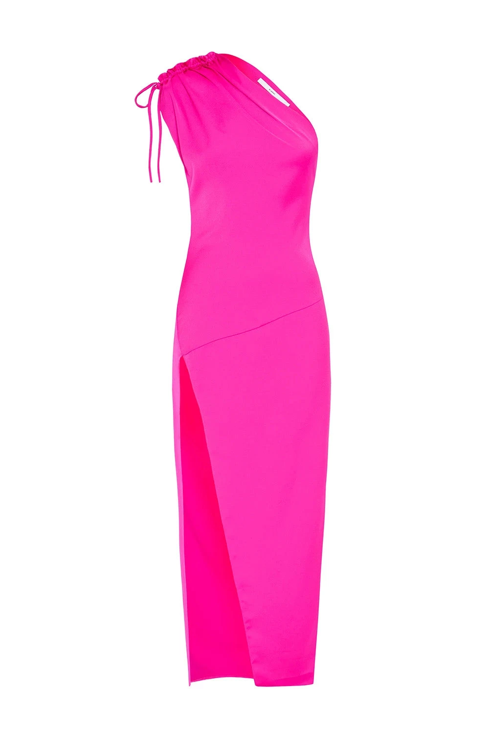 Modern and glamorous, the ‘Sliced Out Asymmetric Dress’, is a combination of liquid-like fabric and masterful draping. This long line dress is made from sumptuous satin that’s cut on the bias, which drapes from the shoulder fluidly over all curves to the ankle. Featuring an asymmetrical neckline that is gathered at the shoulder with a tie and a sultry thigh high leg split this dress is perfect for your next glam event.  Tip on how to wear; the split is high and can be pulled down and to the side. Make sure the split sits on the very side of your leg for ample coverage.Â