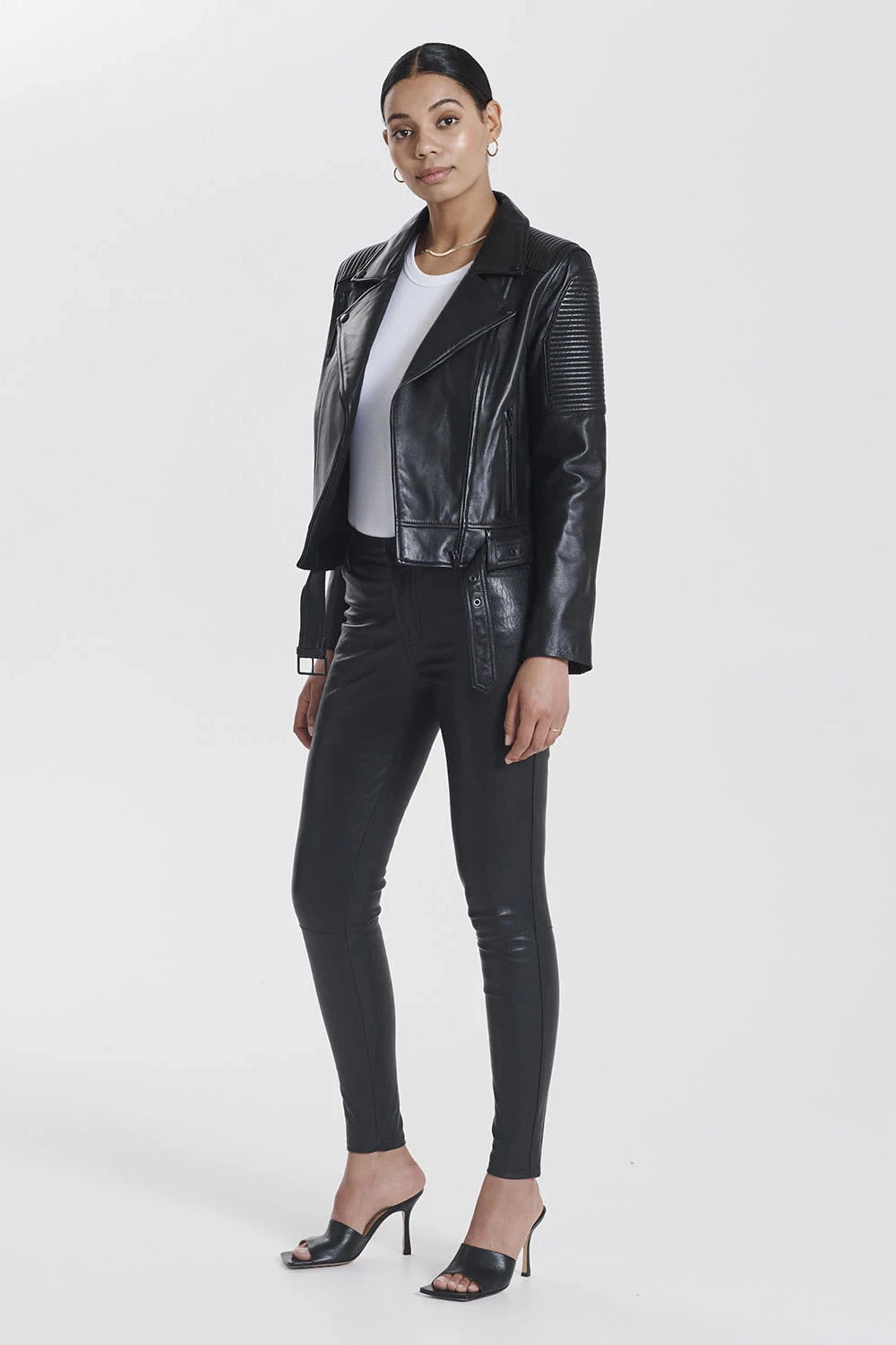 The Classic Biker Jacket is a timeless investment. This style is cut from butter-soft lamb leather, lined with a woven fabric and finished with high-quality custom matte black hardware. It features quilted ribbed panelling detail on bicep and shoulder, zip open cuffs, snaps on lapel collar, back armhole gussets for easy movement and a removable belt. This is the ultimate leather jacket.