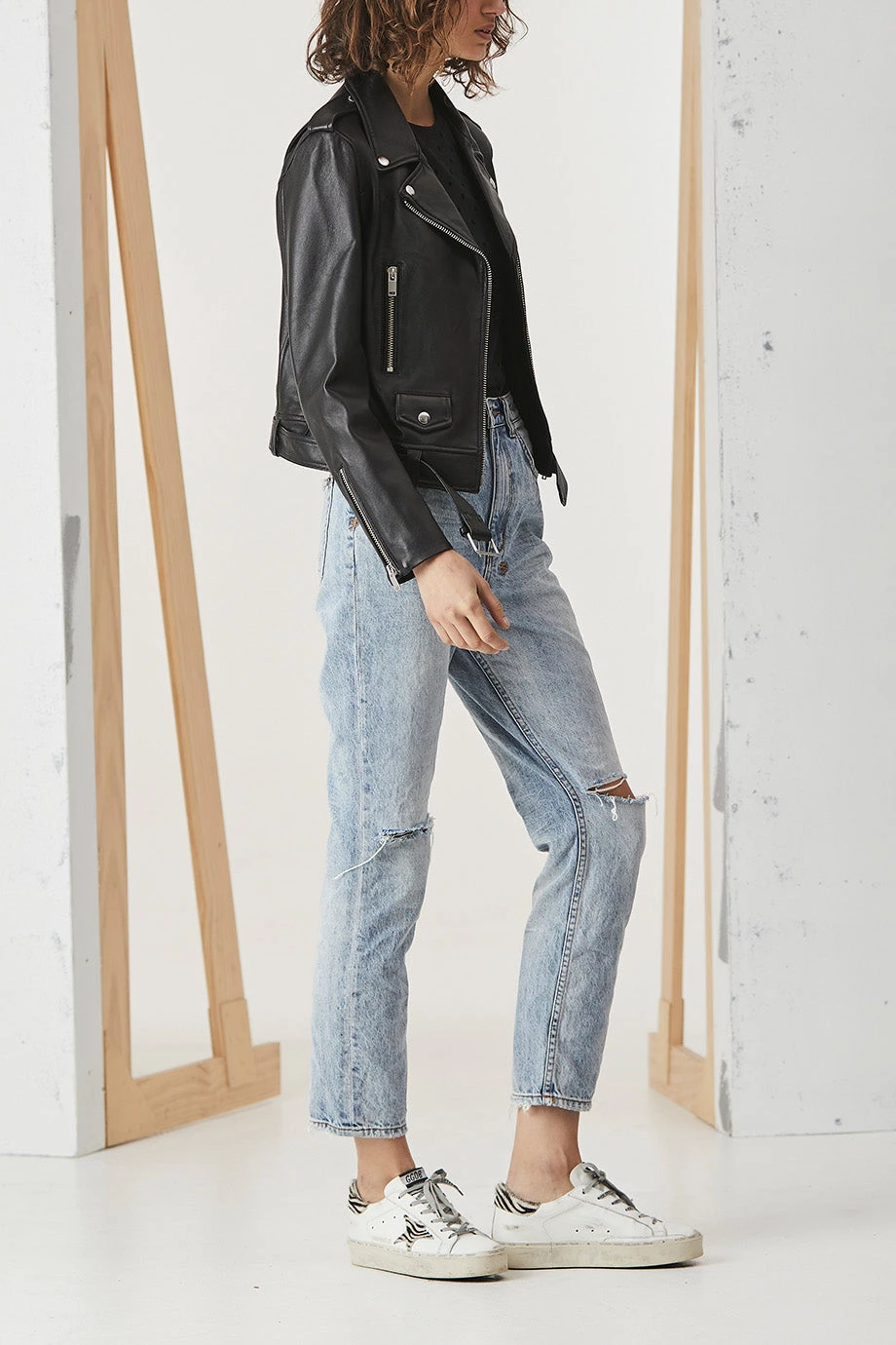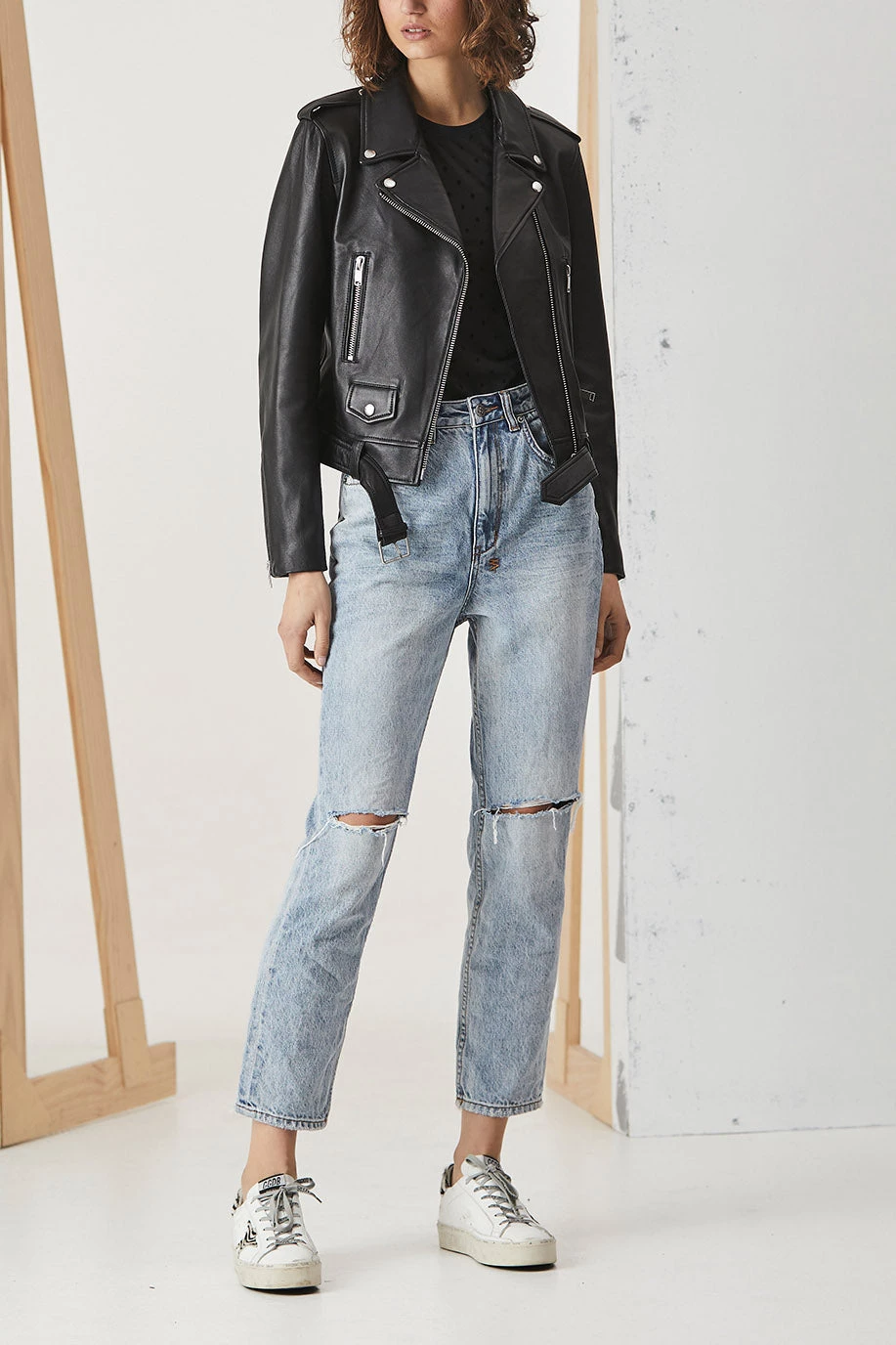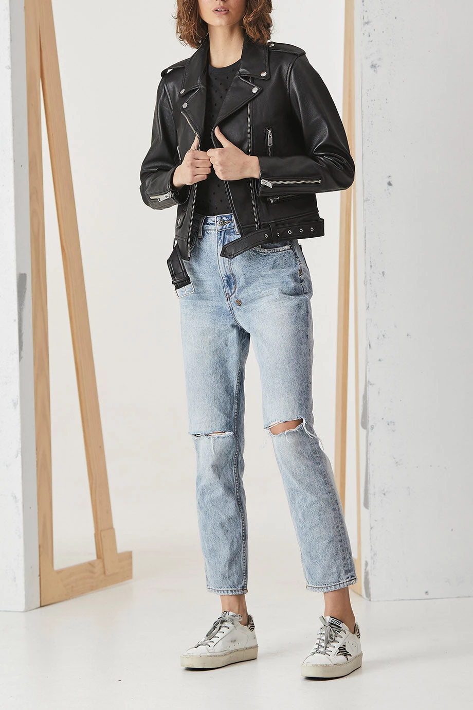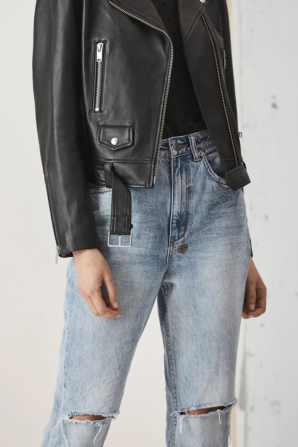 The New Yorker Jacket is made from our New Zealand lamb skin and comes fully lined. The New Yorker Jacket is finished with high-quality silver custom hardware and features zip open cuffs, snap lapel collar, back armhole gussets for easy movement and a removable belt.