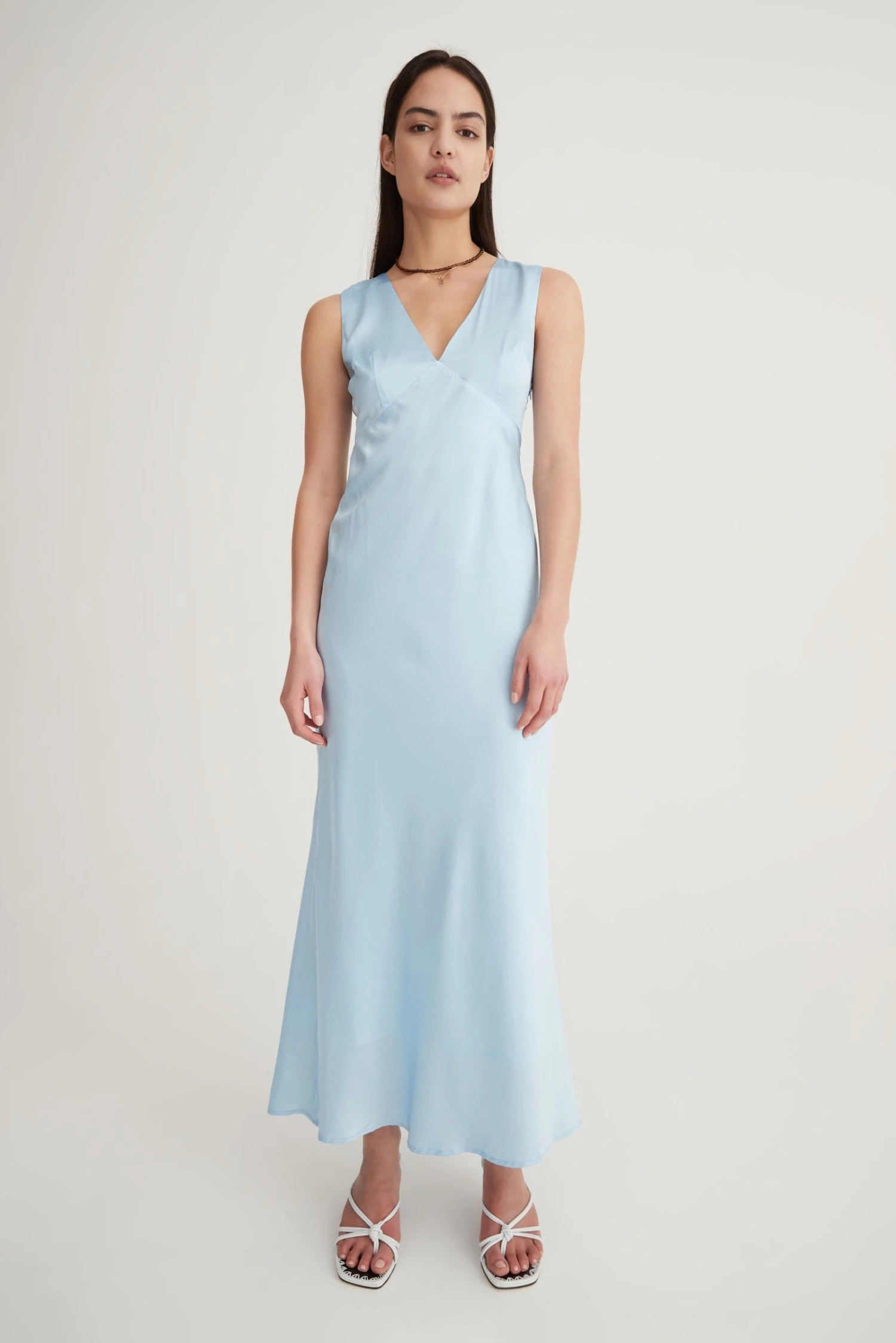 The Jessa Silk Dress cut in a Silk Satin is the perfect style for all occasions. This long v neck midi dress is cut on the bias and has two darts at the bust for a flattering fit. Fitted through the waist and fluted at hem the Jessa makes the perfect dress for a wedding or formal.