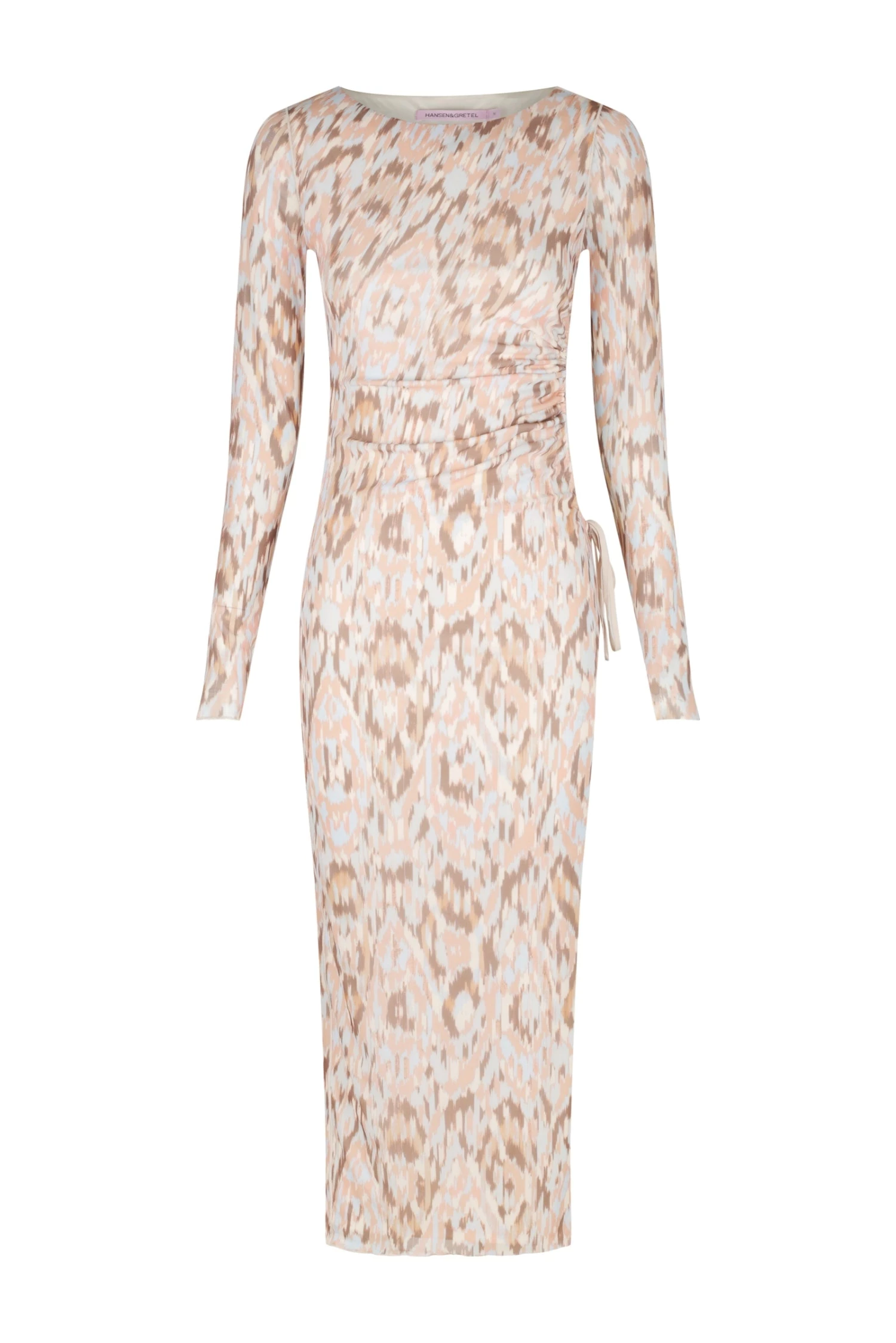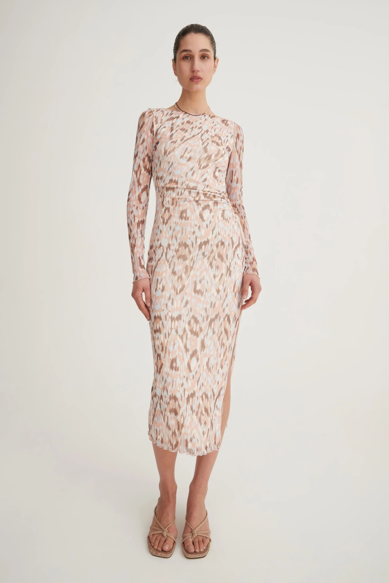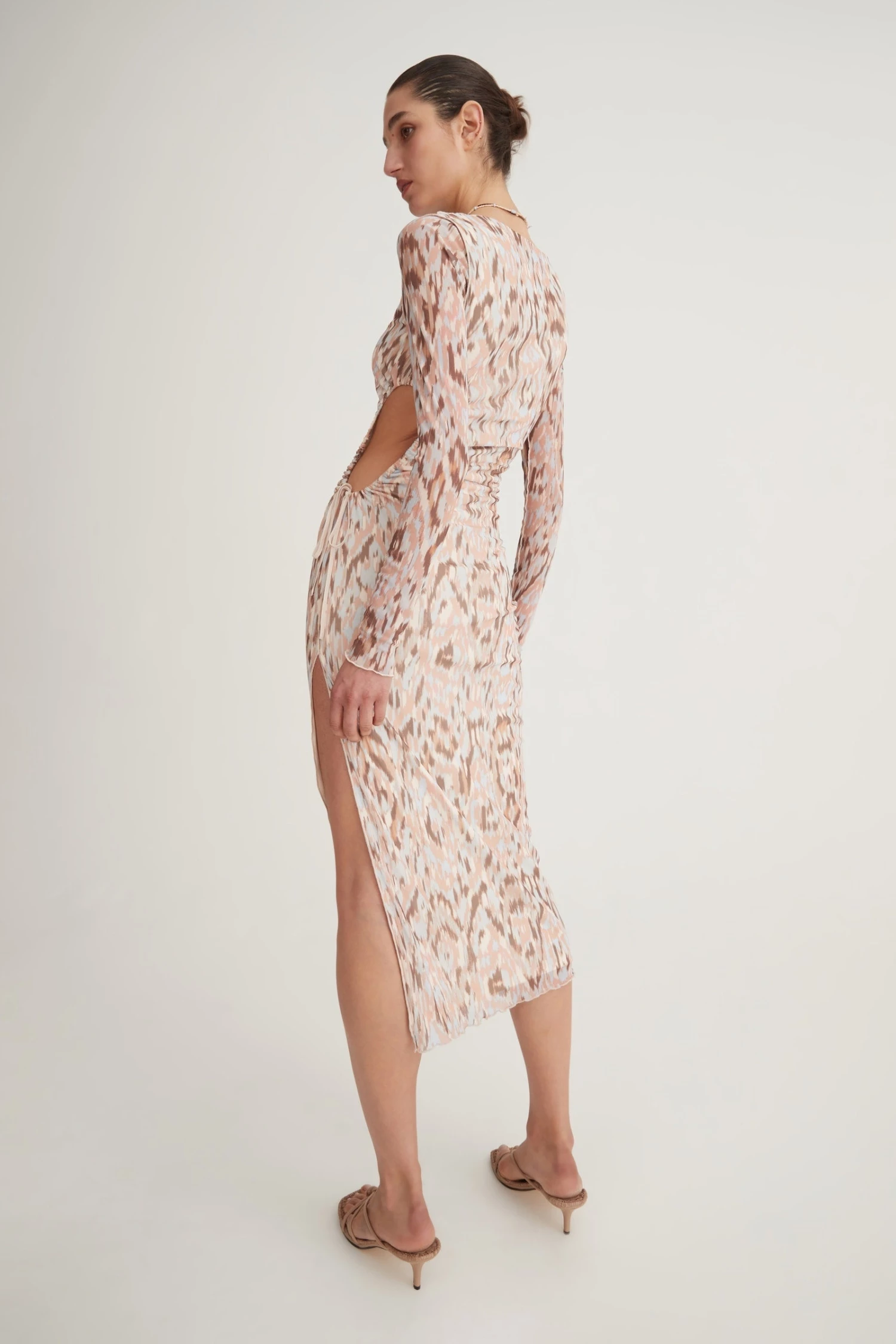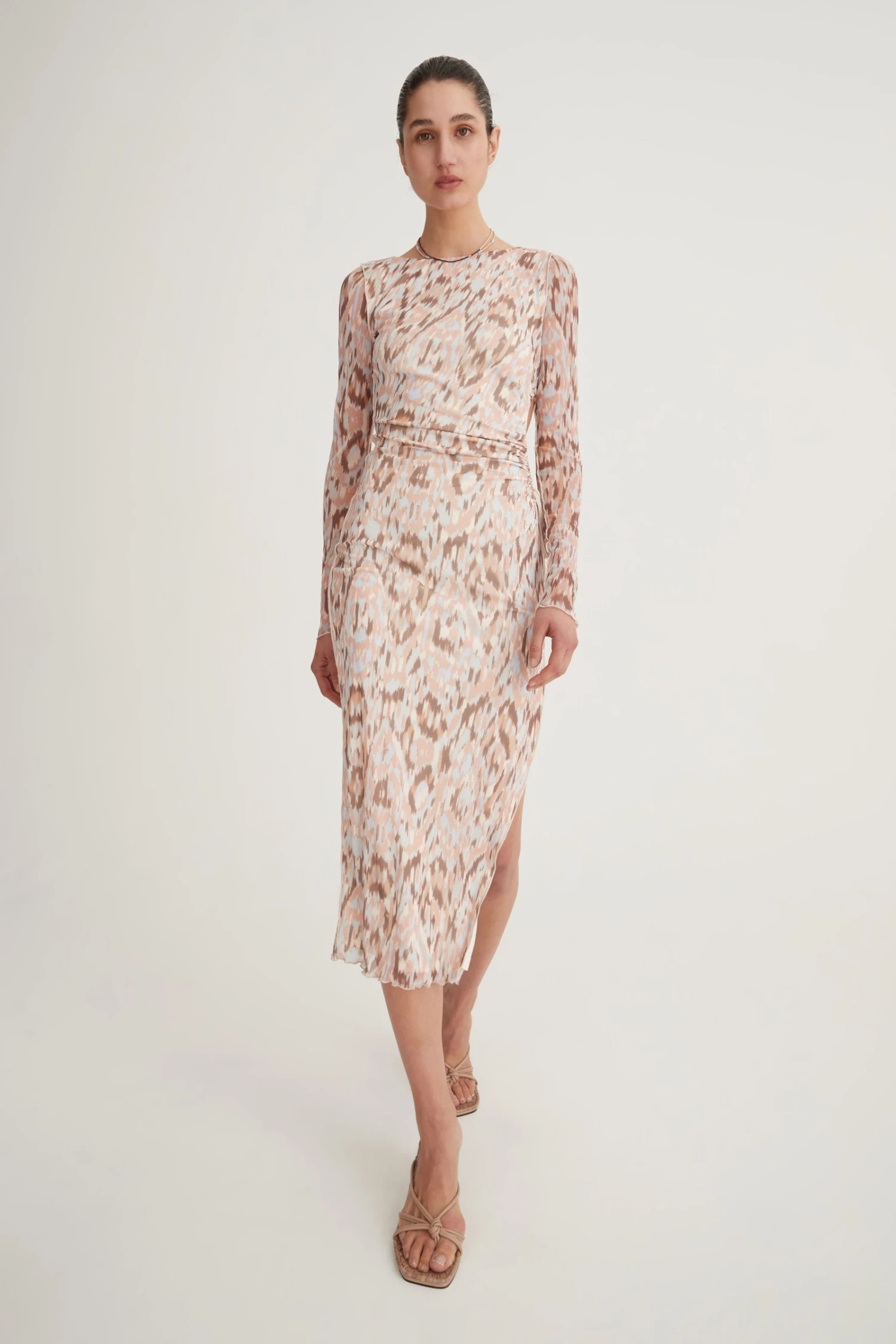 The Athena Dress, an asymmetric style dress in our new Moon Haze print, featuring a side split and cut-out which can be adjusted with drawstring ties at the waist. With a full length sleeve and fitted to the body.