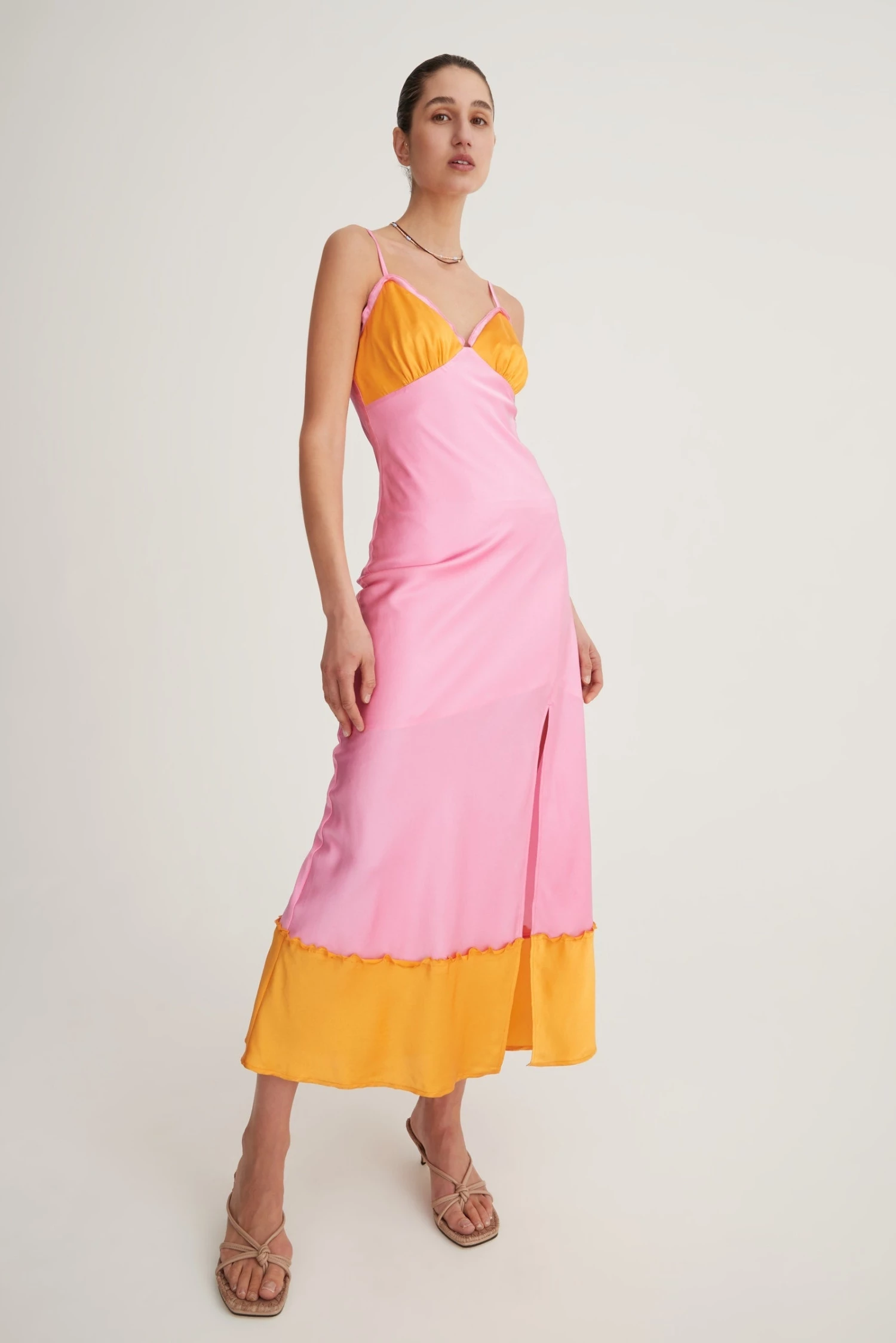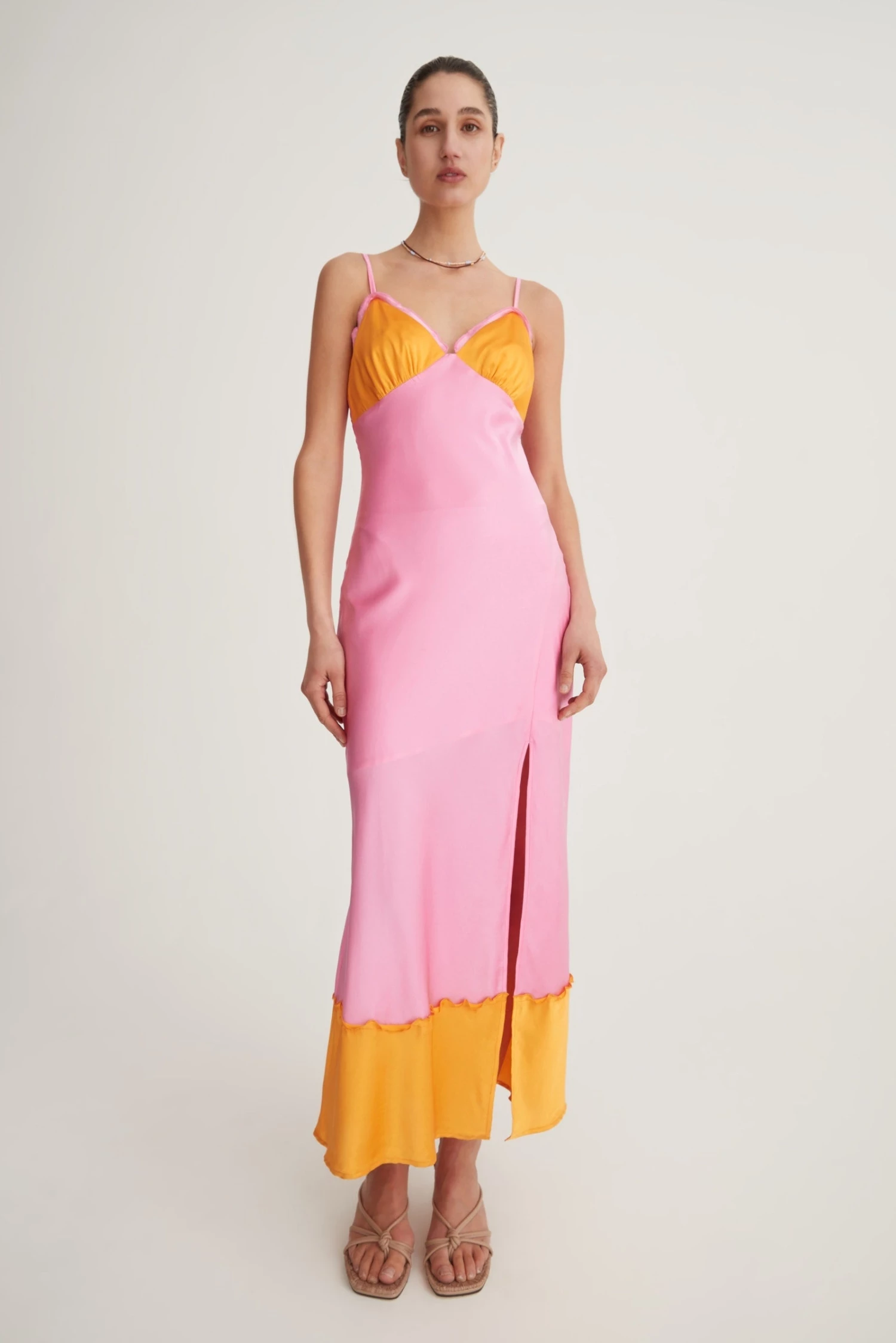 The Hayley Dress, has been cut in a Silk Satin. This is a feminine silhouette featuring gathered bust panels finished with a ruffled trim, a high leg split and a ruffle trim at the hem panel. Contrasting panels of Orange and Pink are a new detail for this style.