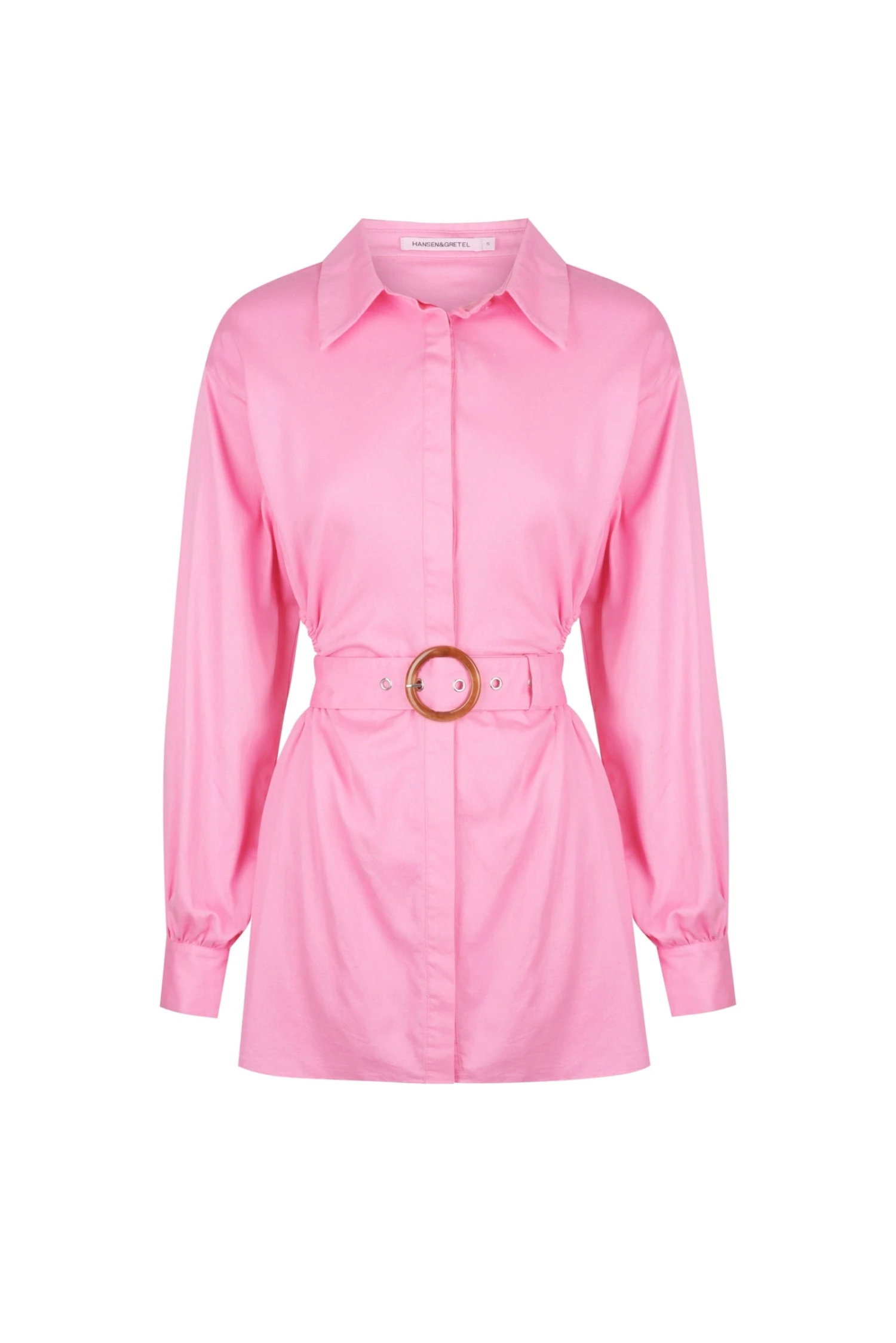 The Tulum Shirt Dress crafted from a cotton shirting is a classic style defined by elasticated cut outs on the side of the waist. Cuffed long sleeves, yoke line and a pointed collar create a tailored finish. With a curved hemline creating shape at the bottom of the shirt. Paired with a matching belt with Tort ring detailing.