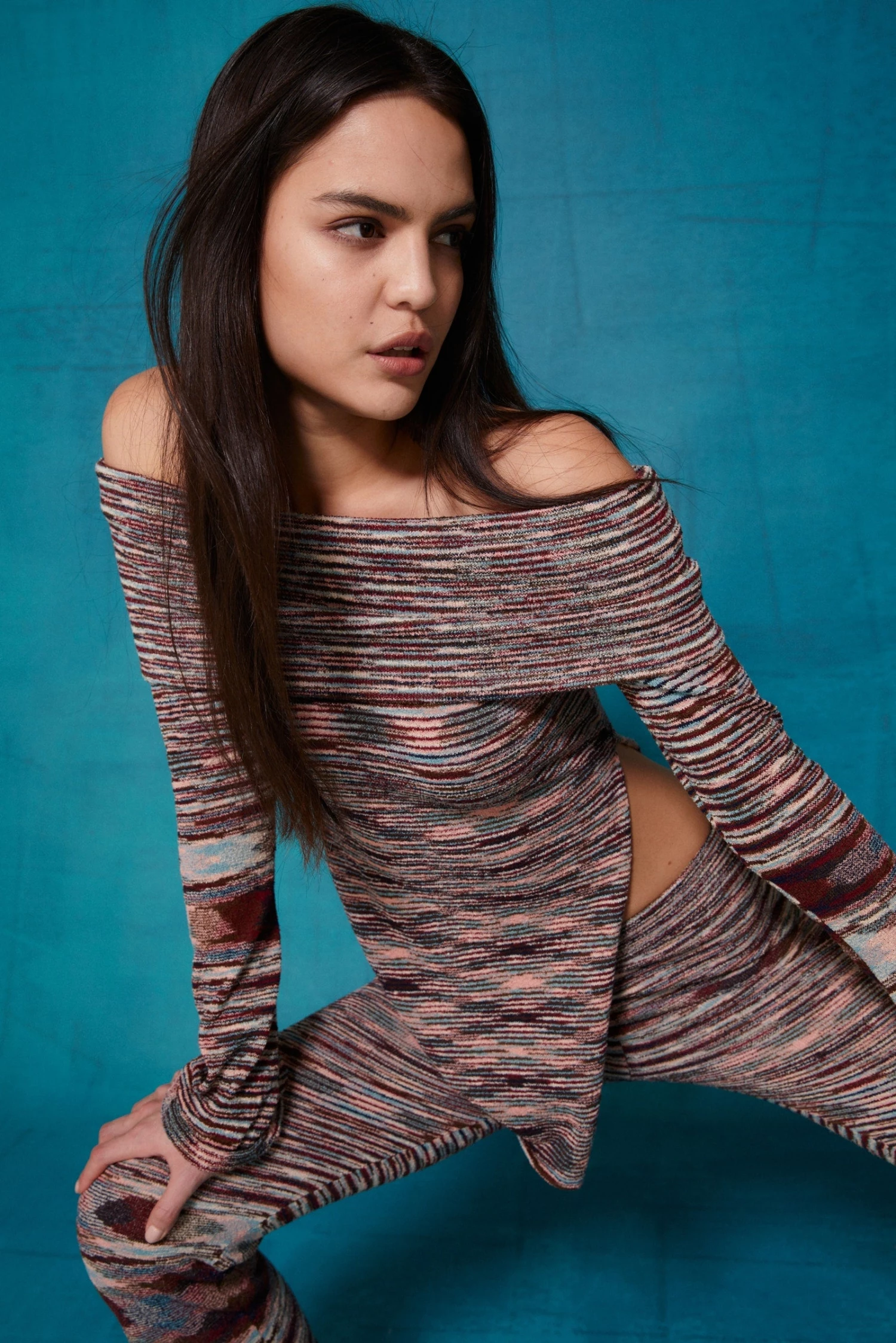 This off the shoulder knit top is a timeless design, featuring a fold down neckline with gel tape for security, accentuating the shoulders and collarbone. The slightly flared long sleeves and asymmetric hem. Pair with the matching Minogue Skirt available here.