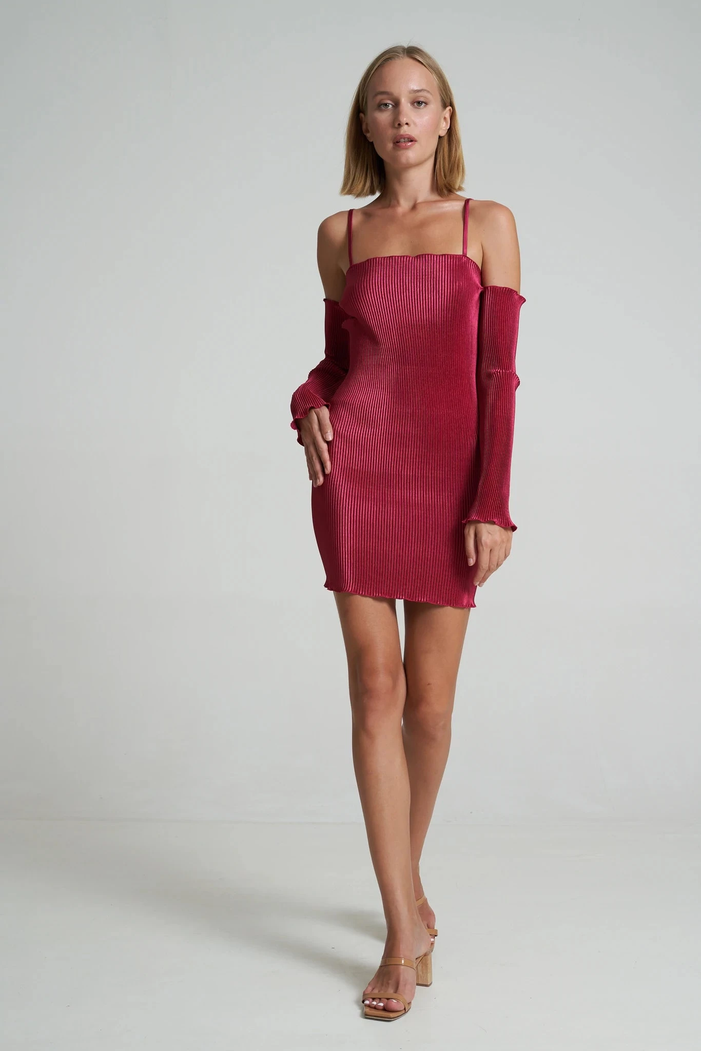 The perfect cocktail ensemble. A figure hugging silhouette in an iconic soirée pleat, featuring long detachable sleeves and delicate straps the shape flatters all parts of the female form.