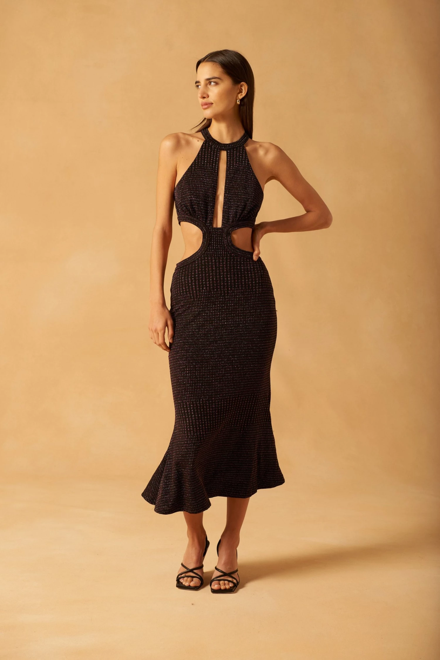 A dazzling addition to your wardrobe, Marisa will turn heads at your next soirée. Featuring statement cut outs at the front and sides, Marisa’s midi length is complemented by a soft fishtail hemline. Made from a luxurious slinky jersey in a striped, sparkle fabrication to help you shine bright.