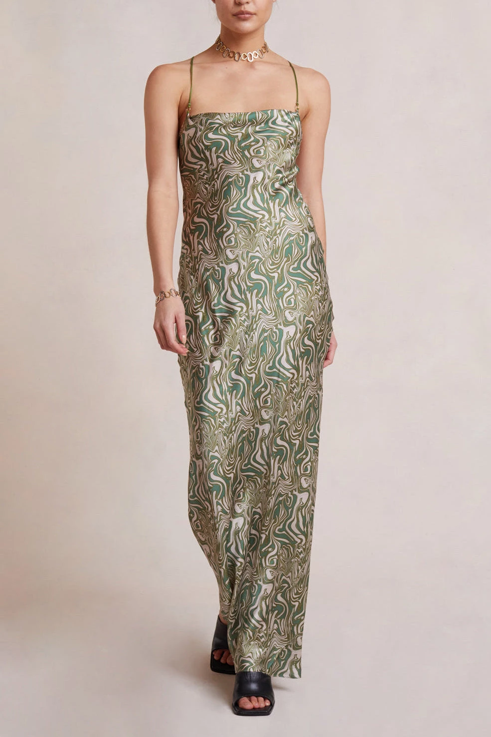 The Alanis Maxi Dress is cut on the bias for a flattering feminine silhouette. This maxi length dress is spun from a signature floral print silk fabric accented by an O-ring detail and thin rouleau straps, finished with back cross self-ties.