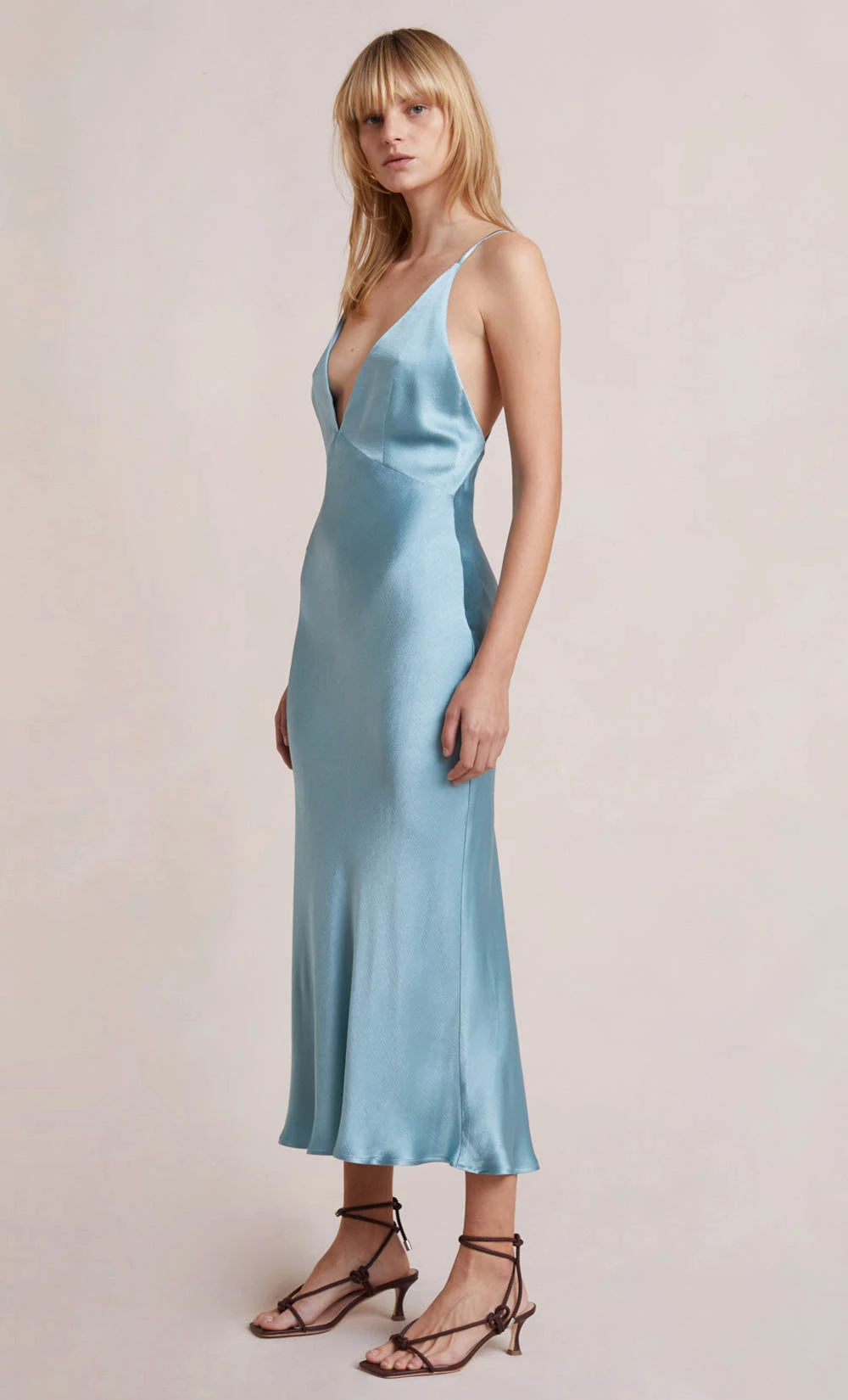 Make an entrance with the alluring Marley Midi Dress. Cut on the bias from a lustrous satin fabric, this event wear style features a plunge V-neckline complemented by thin rouleau straps that cross at the back. The dress skims along the body with a flowy skirt that falls into a midi length.