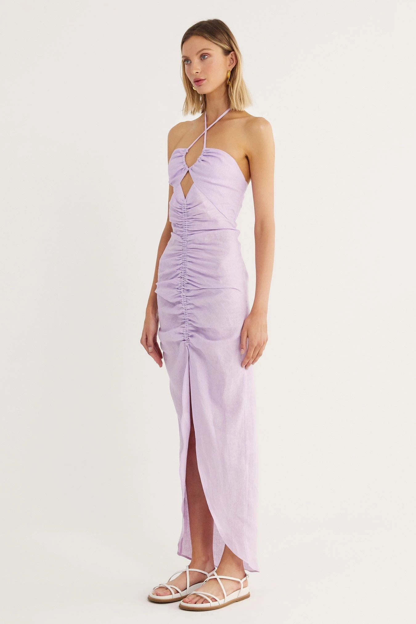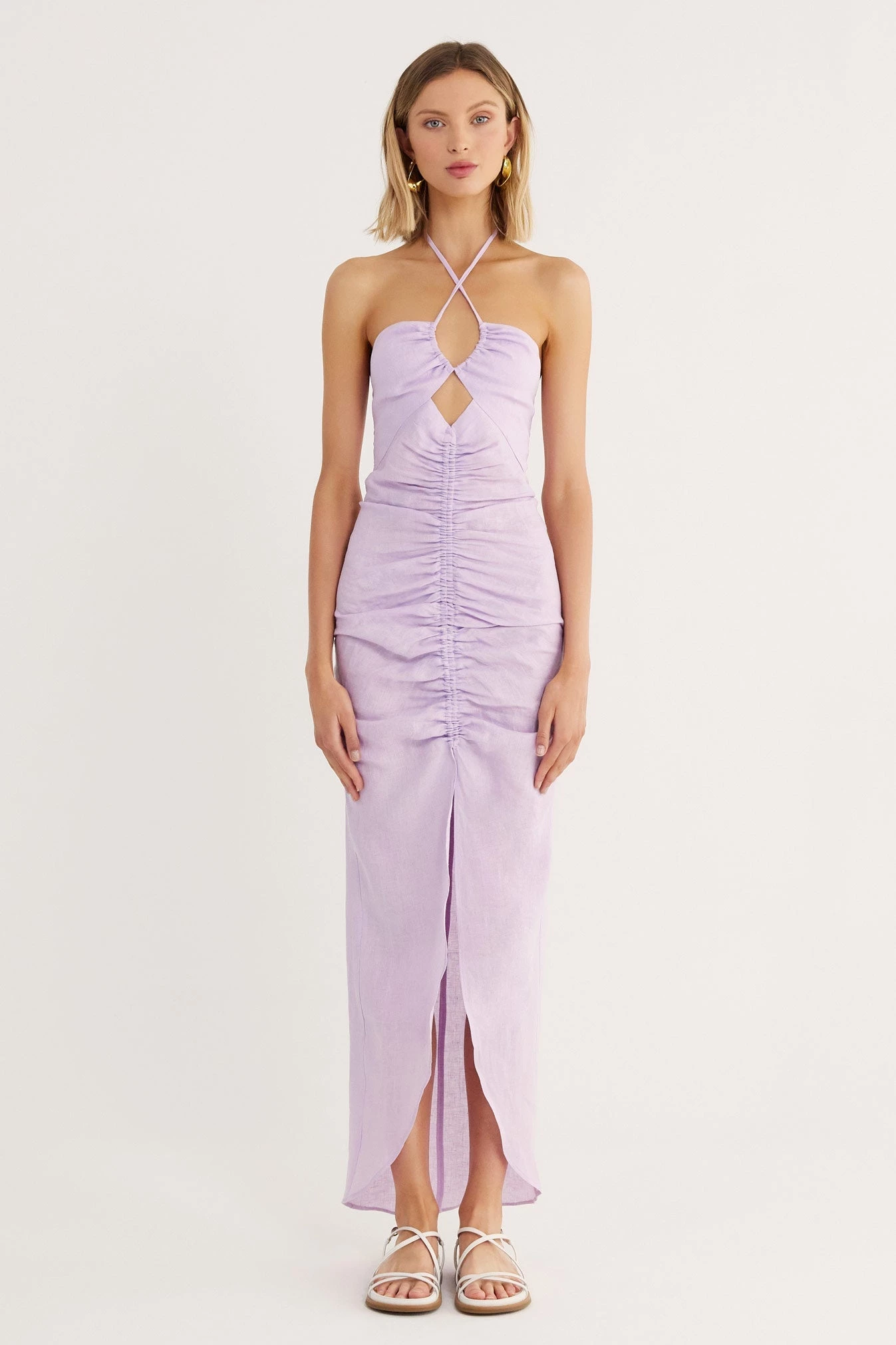 Body skimming maxi with ruching at front, halter ties and diamond cut out.Â
