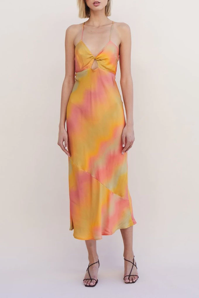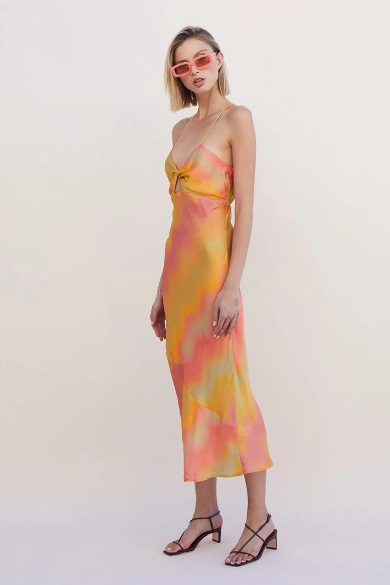 Introducing the Sundown Twist Front Slip Dress, our favourite midi for the summer. This style has been designed to be cut on the bias for a flattering fit. It features a twist at the front of the bust with a keyhole and seam. The shoulder straps follow through to the back which can be tied to your liking.