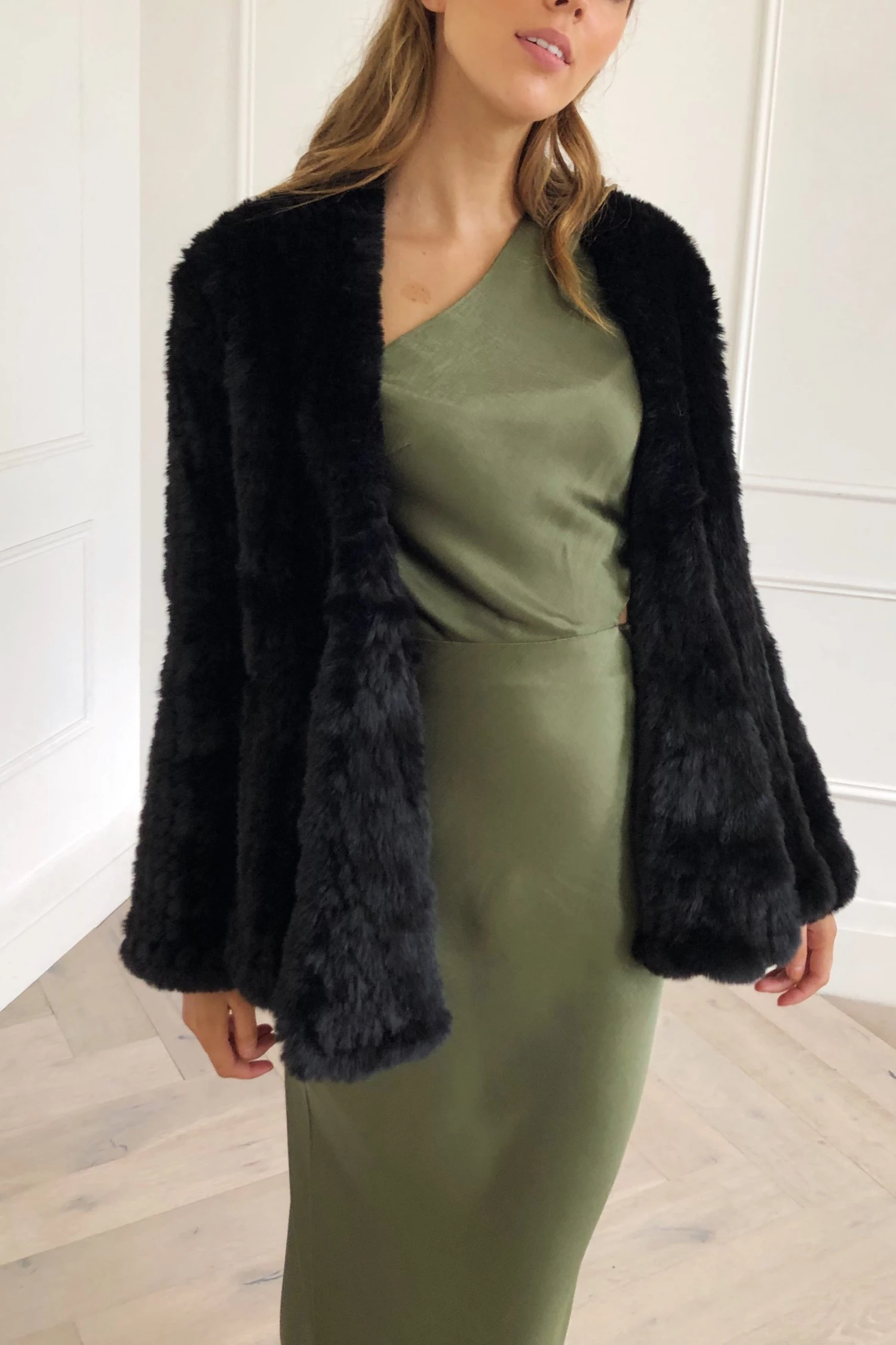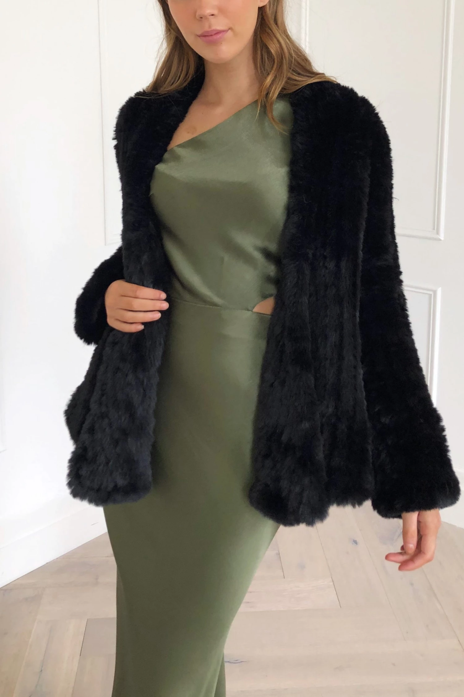 Beau Faux Fur Jacket Toffee. Open knitted faux fur jacket in Black. Ultra soft to touch. Light weight yet, very warm. Relaxed fit. Slight waterfall front lapel. Pair with denim or dresses. Essential throw over for all year round.