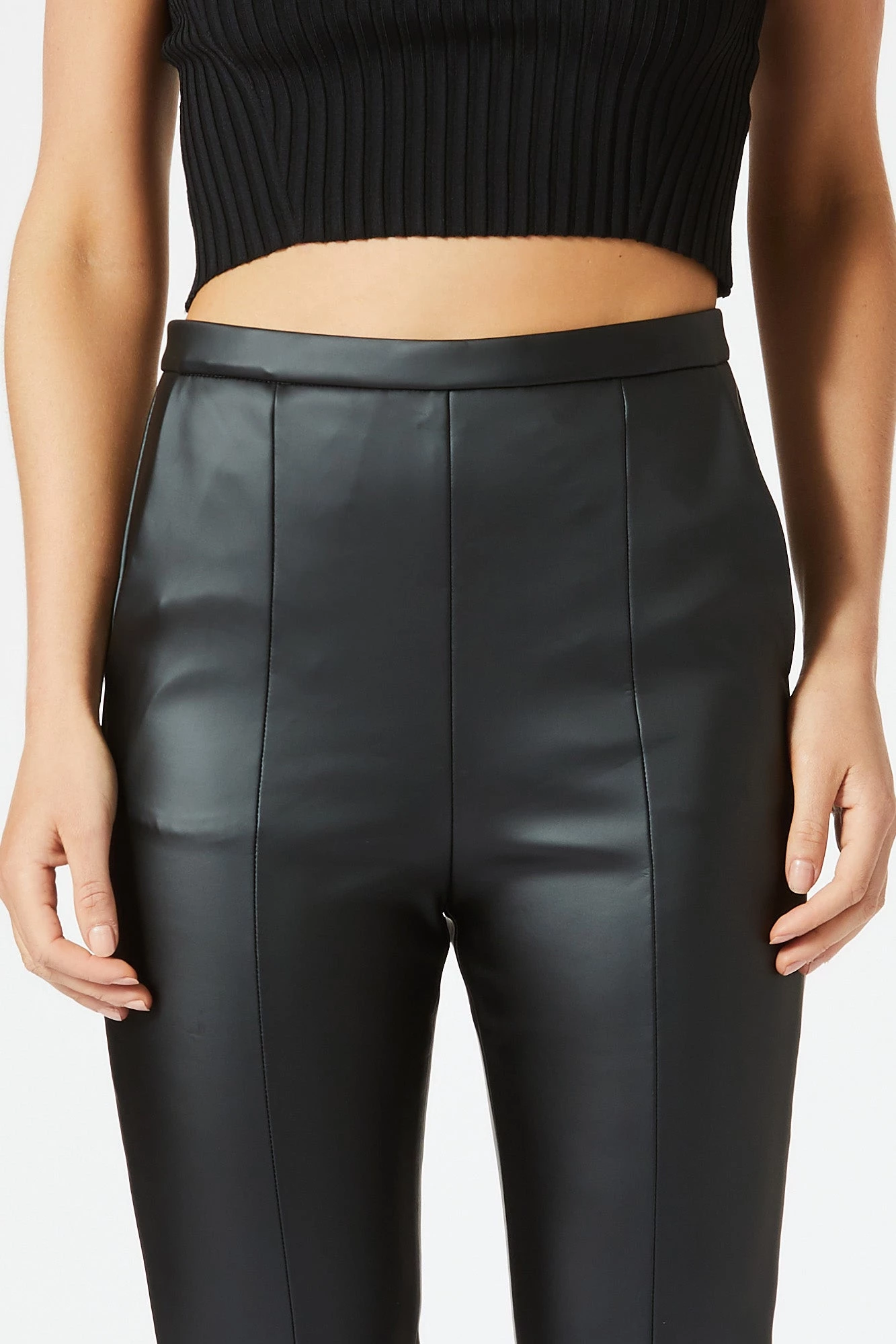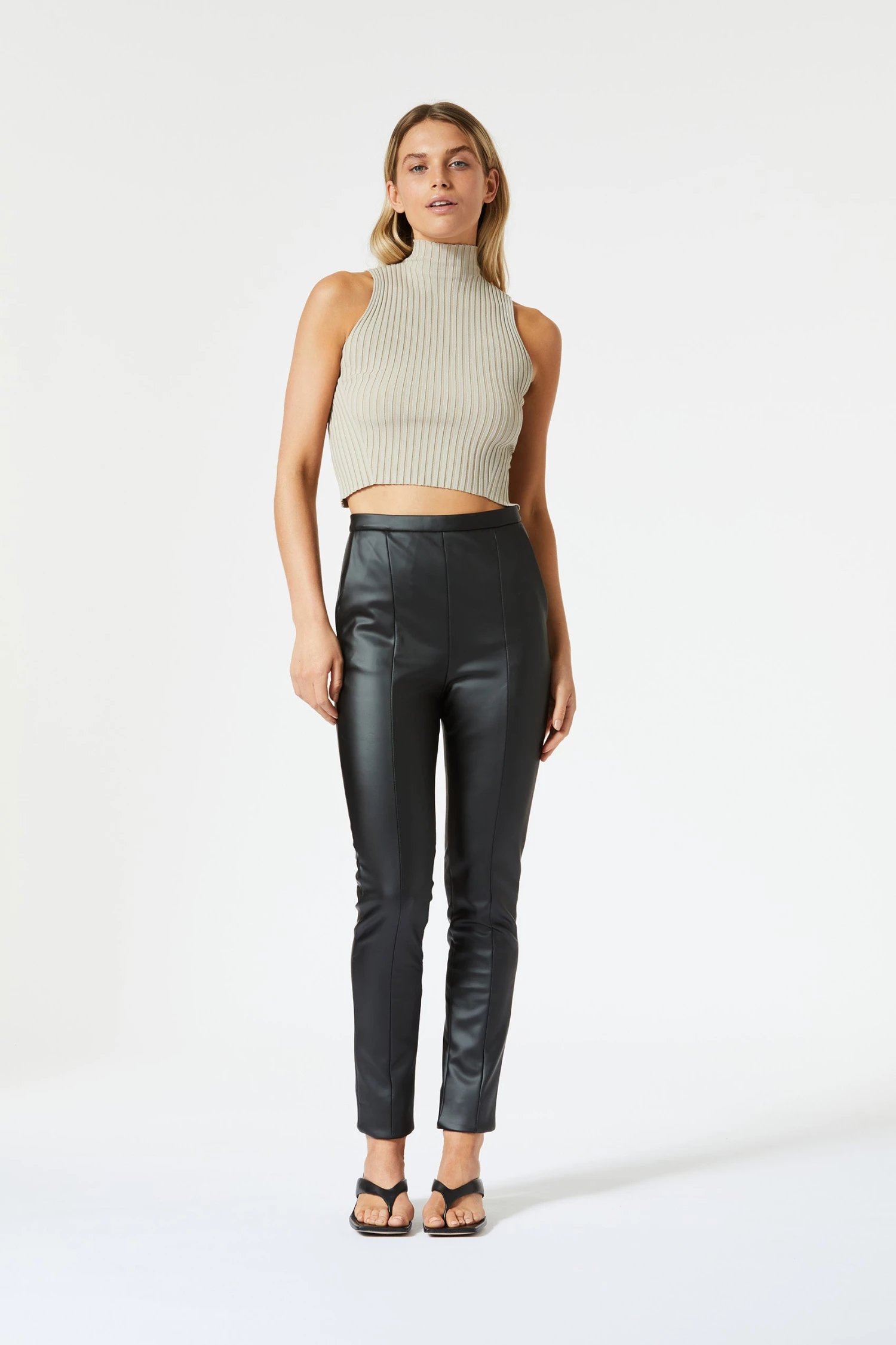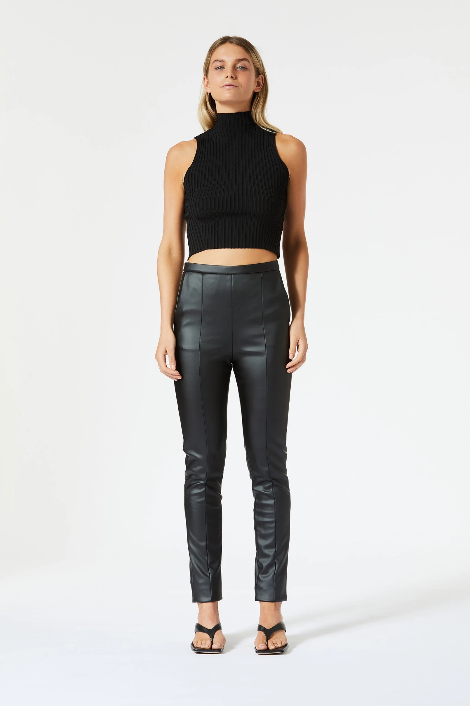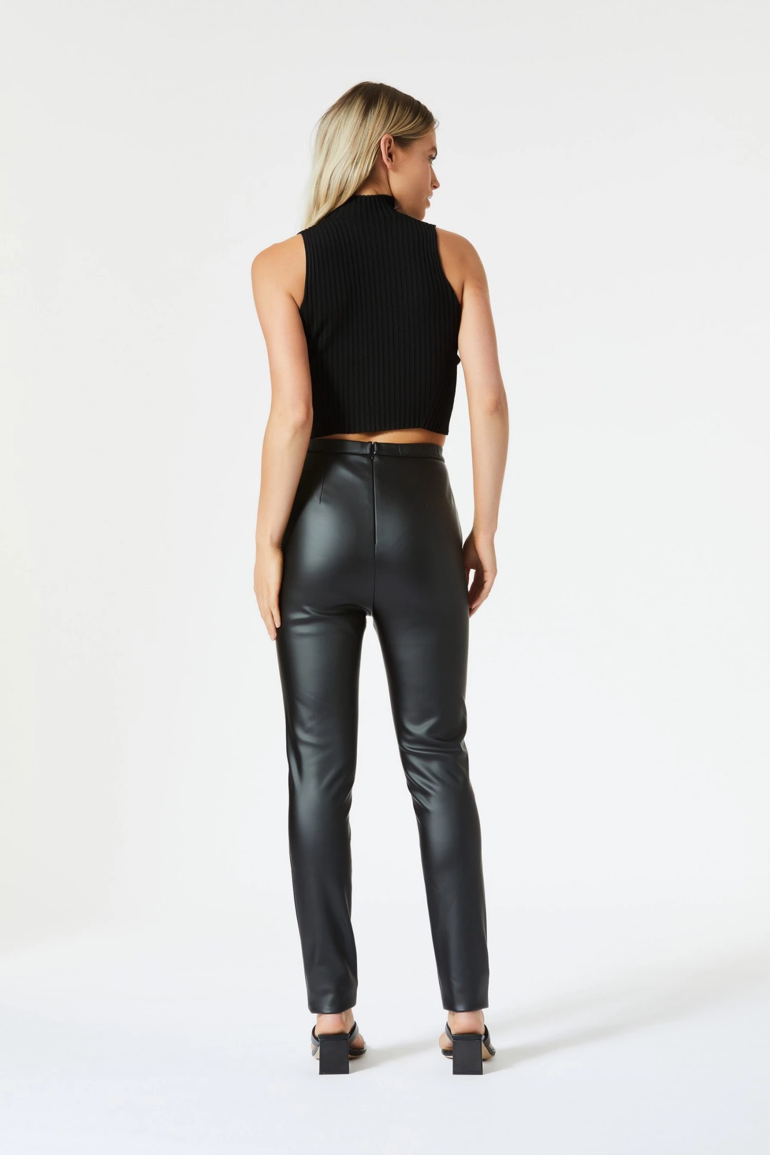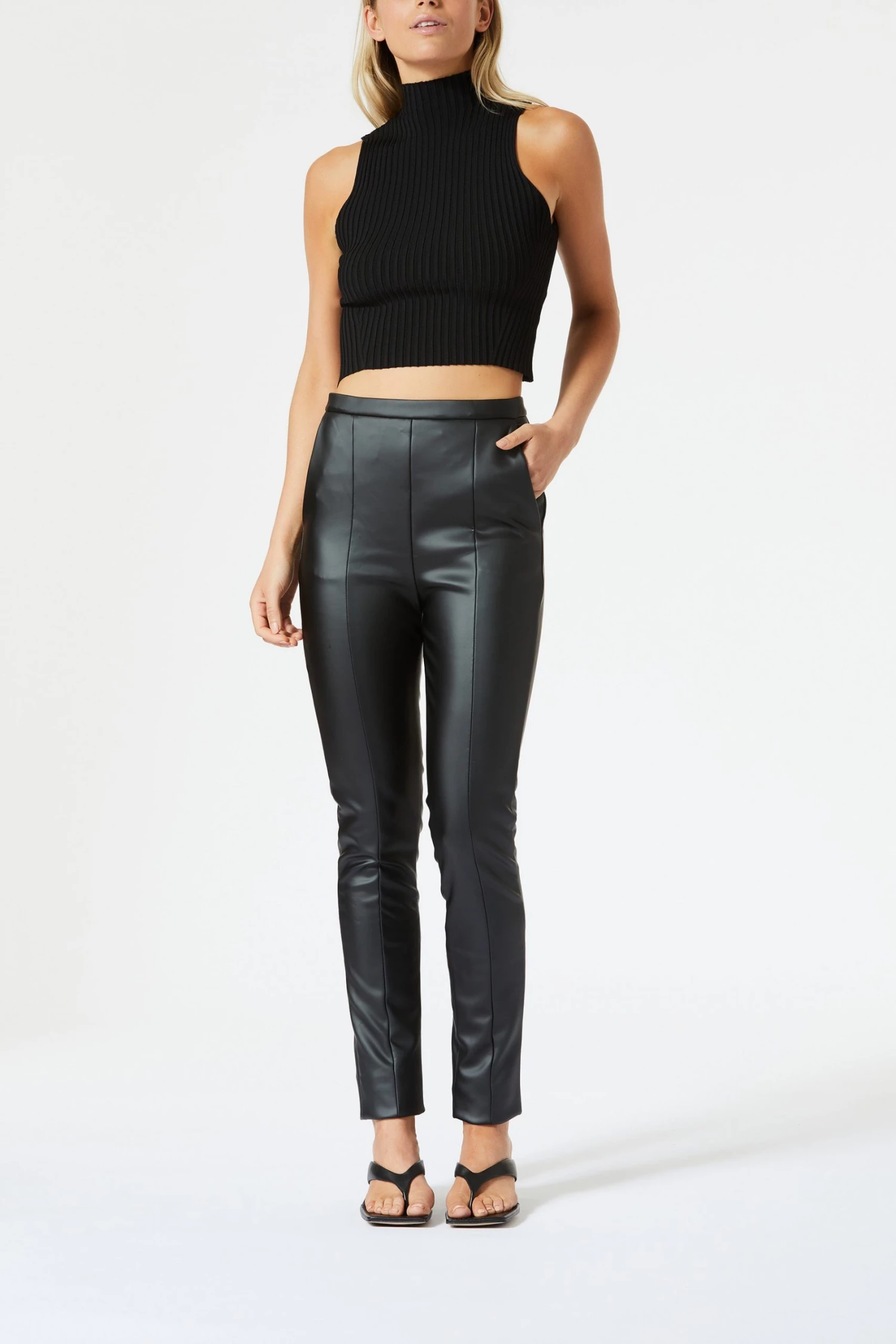 High waisted and fully lined fitted pant with side pockets. Constructed with premium vegan leather with 2-way stretch technology for shape retention. San Sloane tonal branded badge and centre back zip. To shorten, simply cuff by turning ankle inside.
