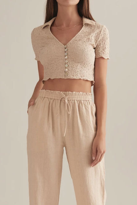 The Whitney Top in Nude is a gorgeous feminine button front design cut in a textured cotton fabrication. Pair with the Monterey Pant styled here.