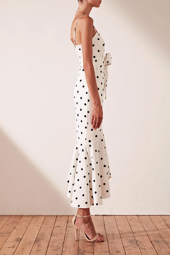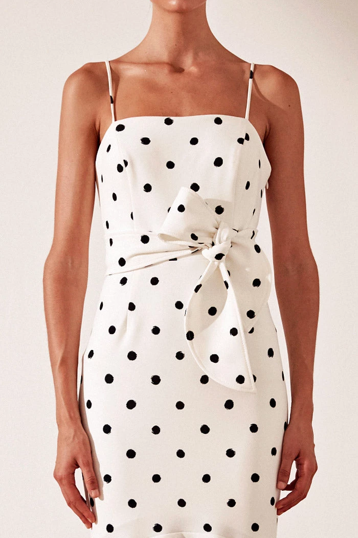 Abigail Trumpet Midi with belt by Shona Joy in the exclusive cream and black spot. This dress in a medium weight woven features straight neckline, adjustable spaghetti straps, attached belt, invisible side zip, asymmetrical hem and short dress lining.