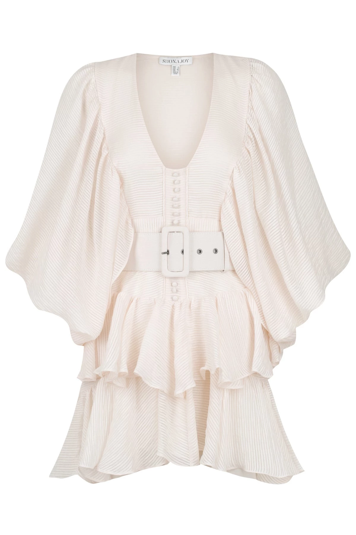 Draped mini dress in a luxurious textured semi-sheer stripe, with hard covered belt.
