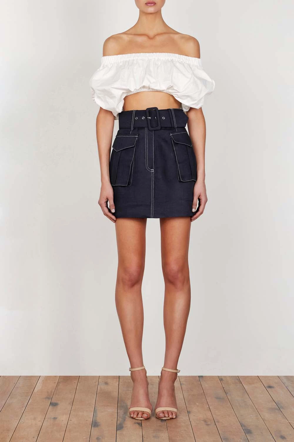 Mini skirt in a medium weight linen twill in a dark navy hue. This skirt features high waistline, detachable fabric belt, fly front closure with button, front patch pockets and lining