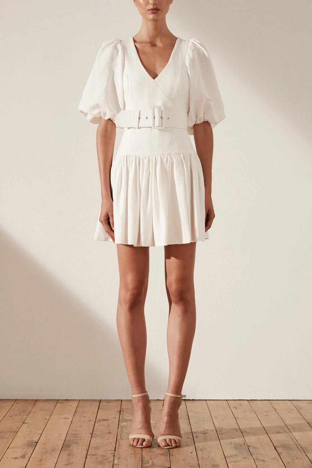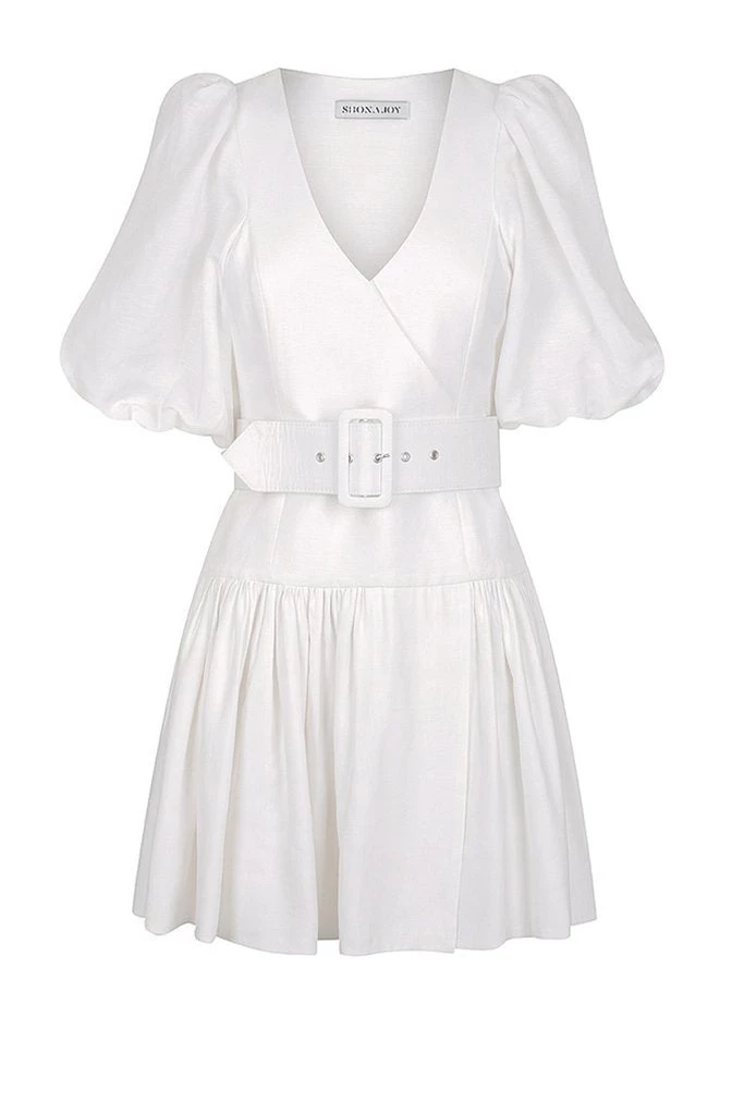 Gaia Puff Sleeve Drop Waist Mini Dress by Shona Joy in Ivory. Puff sleeve drop waist mini dress with belt in a medium weight linen.