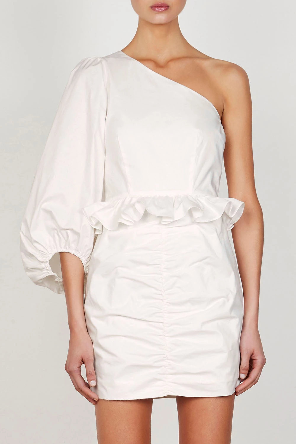 One shoulder mini dress in a medium weight crisp cotton in a bright white hue. This dress features asymmetrical neckline, midi length balloon sleeve with elasticated cuff, waist frill, invisible side zip and ruched mini skirt