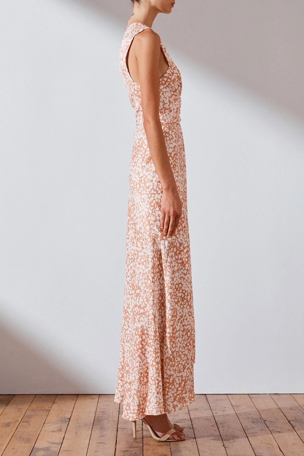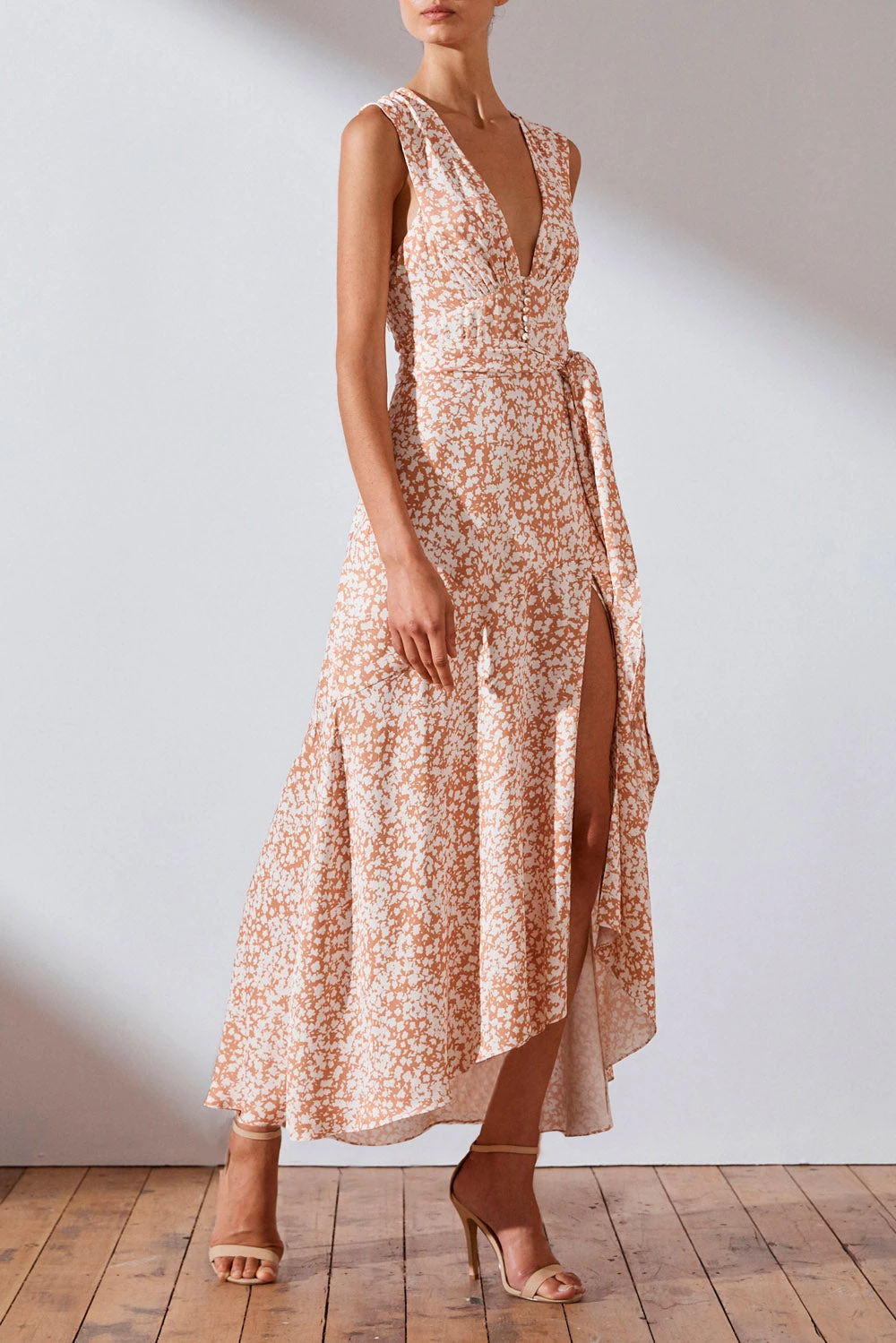Plunged midi dress in the exclusive heather print in a silk touch woven. This dress features low plunged neckline, gathering under bust, decorative front button tab, detachable waist belt, invisible side zip, front hem split and partial lining