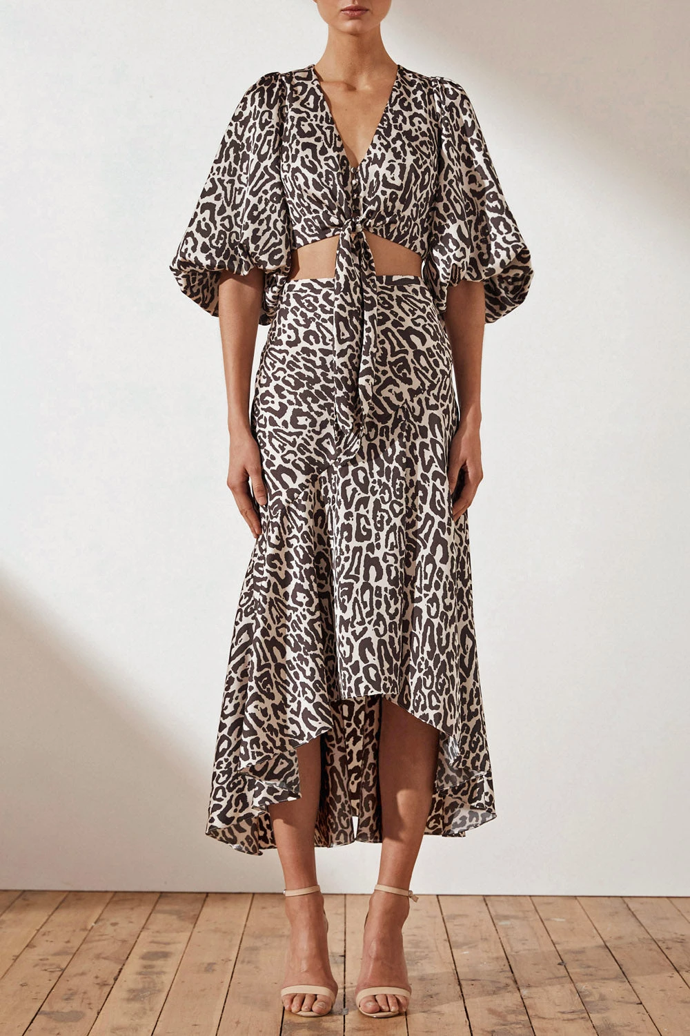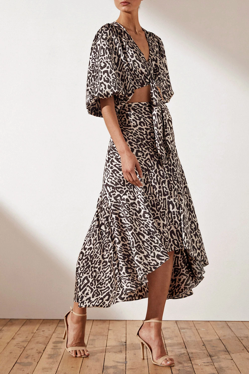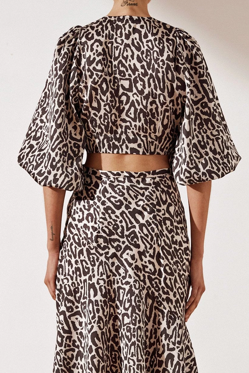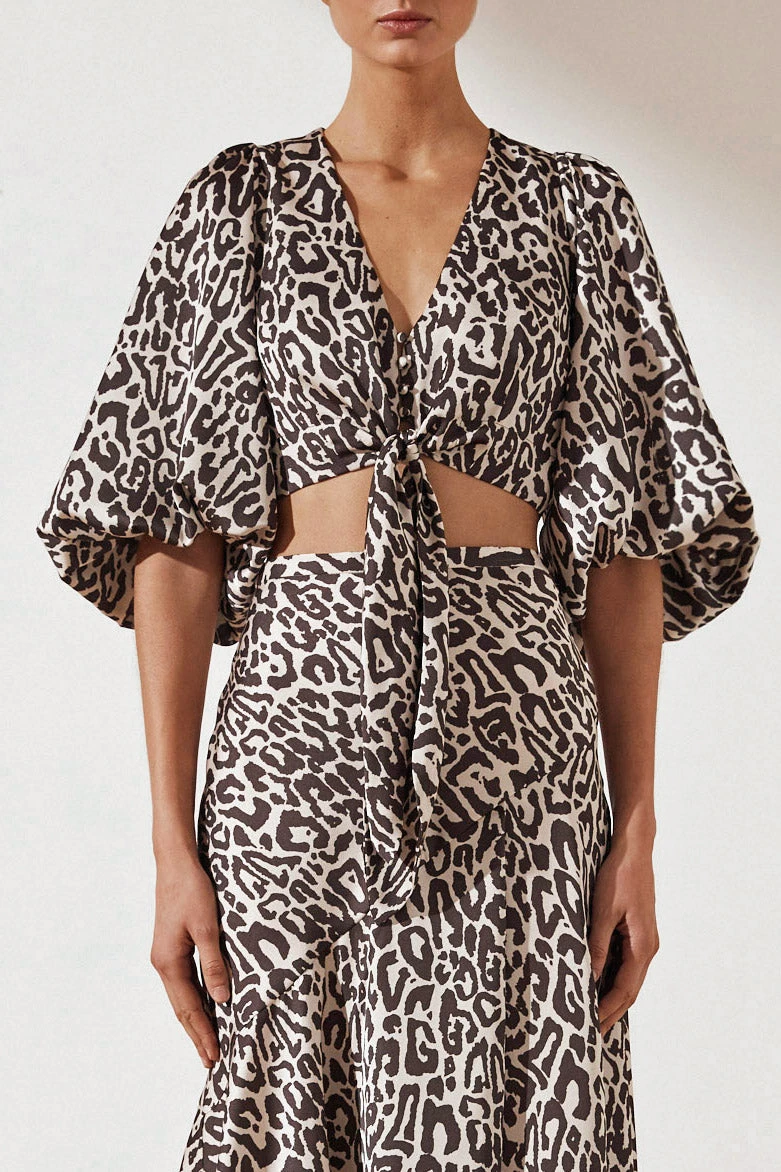 Tie Front Puff Sleeve Top. Puff sleeve top in the exclusive isabella leopard print. This cropped top in a luxurious light weight woven with a silk touch features low v neckline, front button closure with fabric tie and voluminous puff sleeve with an elasticated cuff.