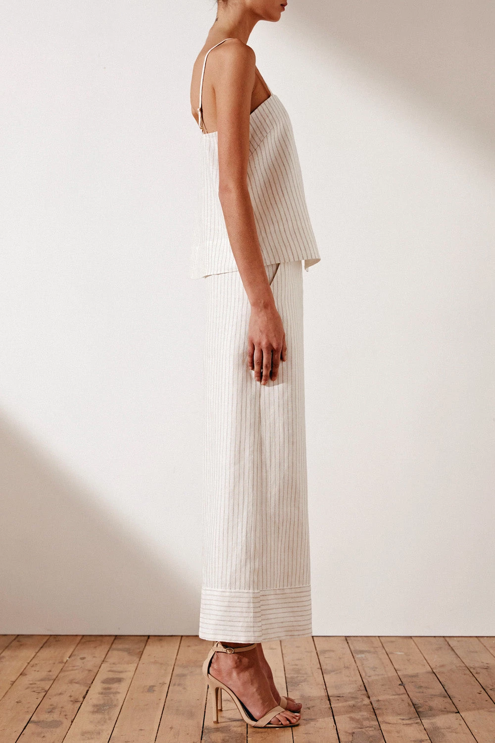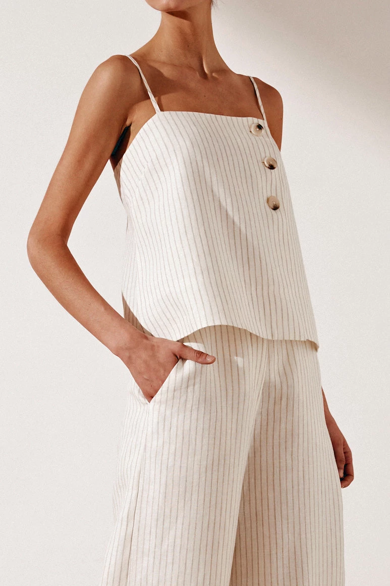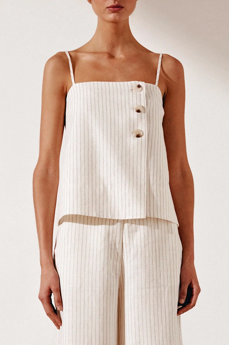 Double breasted camisole in a medium weight linen in a soft natural pinstripe. This top features adjustable spaghetti straps, straight neckline and double breasted button opening