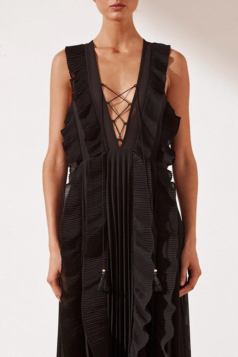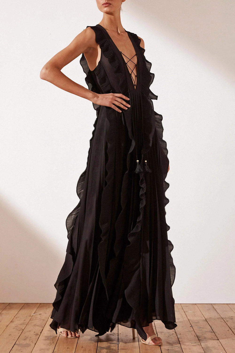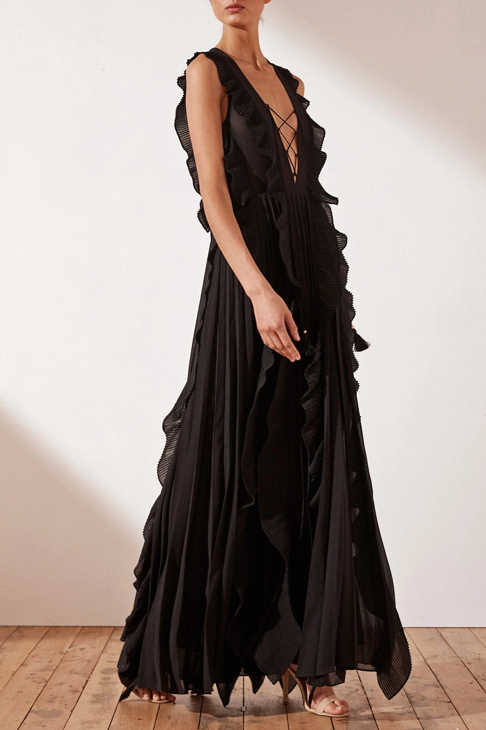 Maxi dress in a light weight pleated chiffon with a semi-sheer appearance. This dress features low v neckline, lace up front, ties featuring tassels and gold hardware, invisible side zip and lined skirt