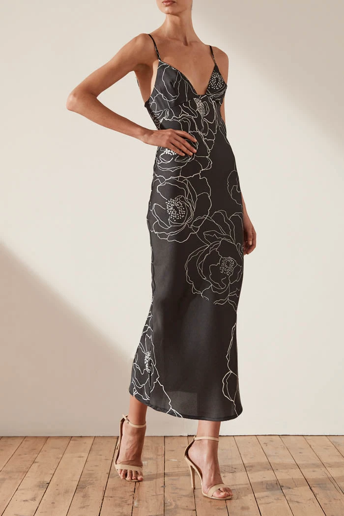 Lucca Bias Slip Midi by Shona Joy. Featured in the exclusive Lucca print. This dress in a light weight woven with a silk touch features adjustable spaghetti straps, low neckline, invisible side zip and midi length skirt with slight flare at hem