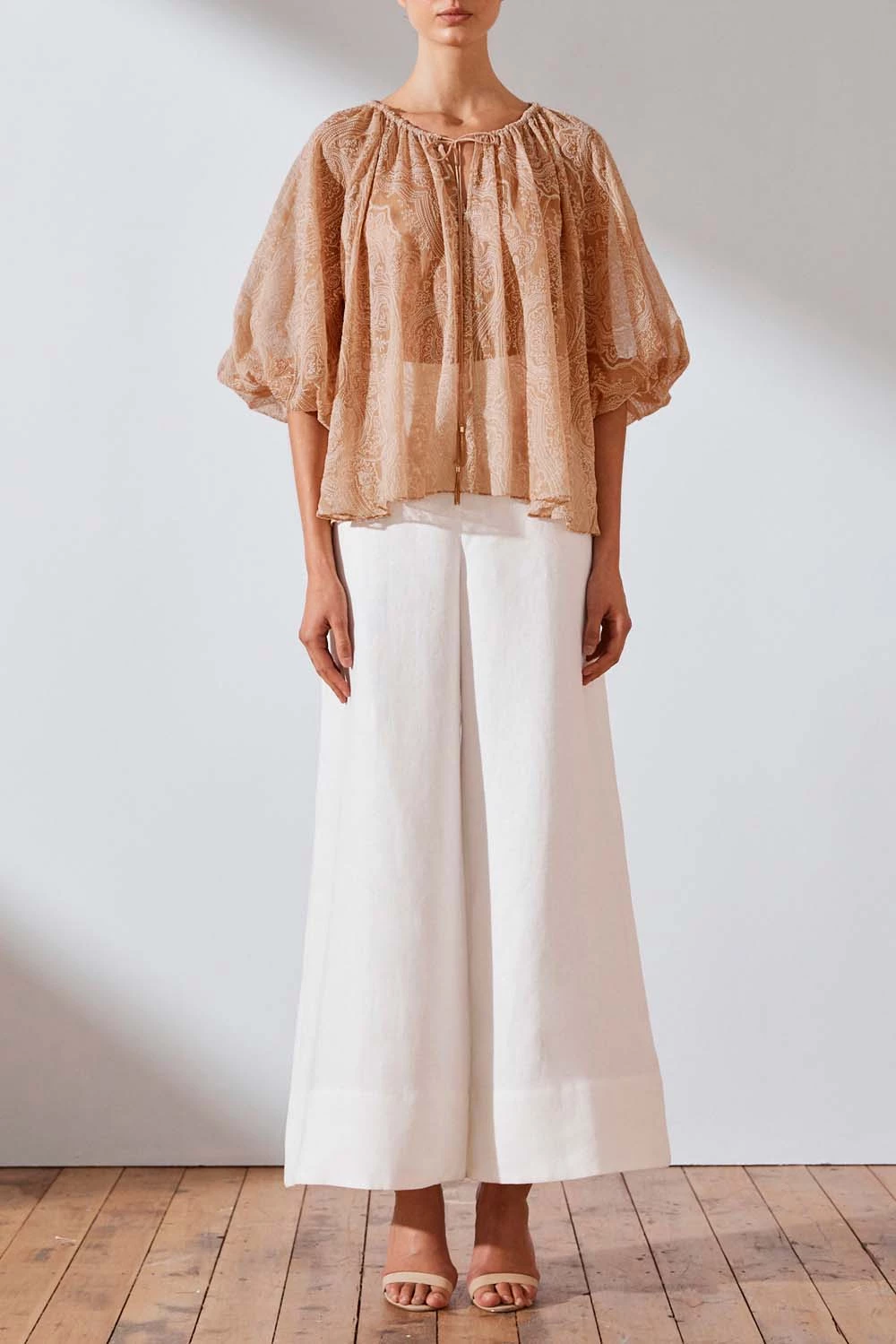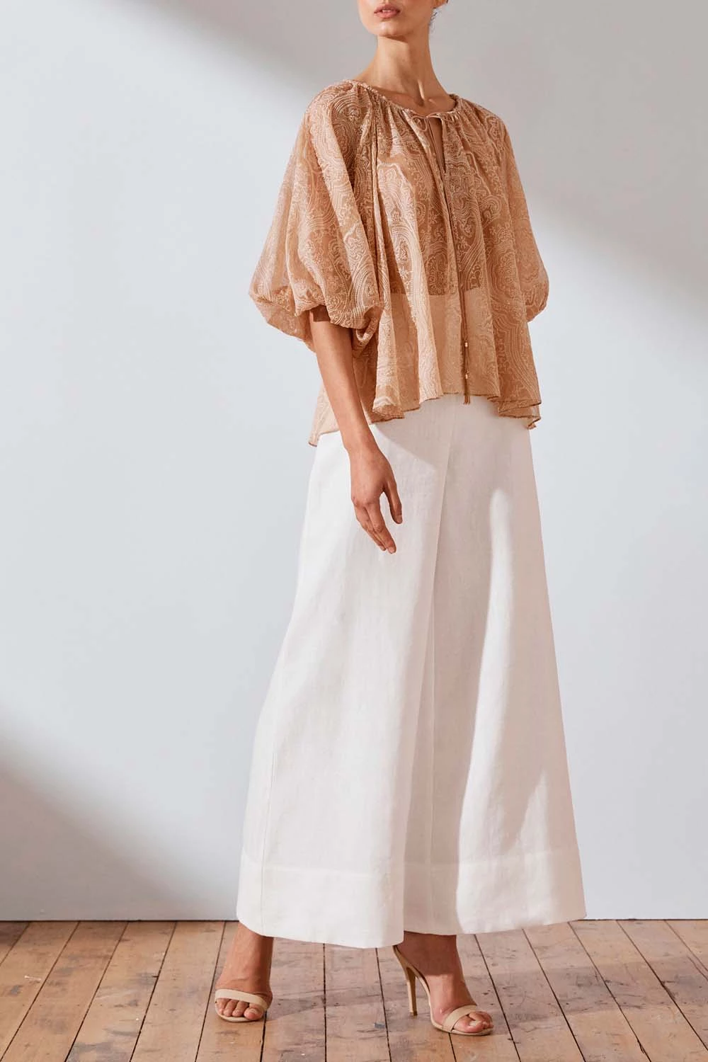 Smock top in light weight semi-sheer crinkle chiffon with a paisley embroidery. This top features round neckline with gathering and fabric tie with gold coloured metal tassel, balloon sleeve with elasticated cuff and a flared hem