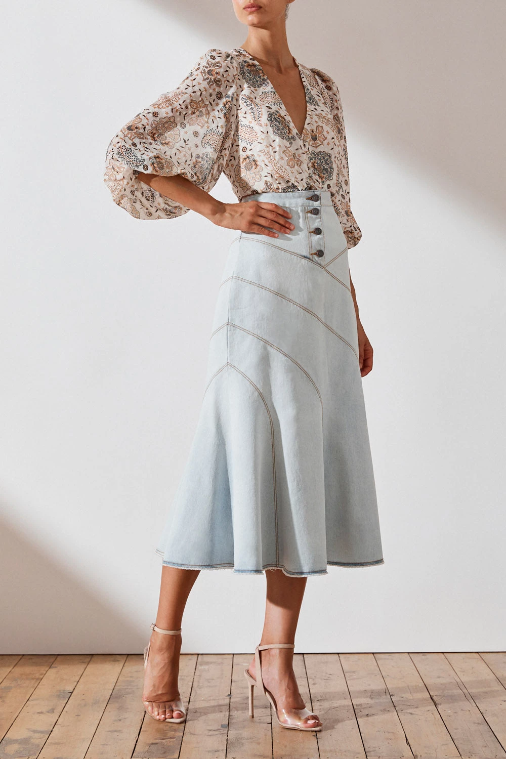 Contour denim midi skirt in a light blue stone wash. This skirt features high waistline, front button closure, top stitched contour panel lines and flared hem