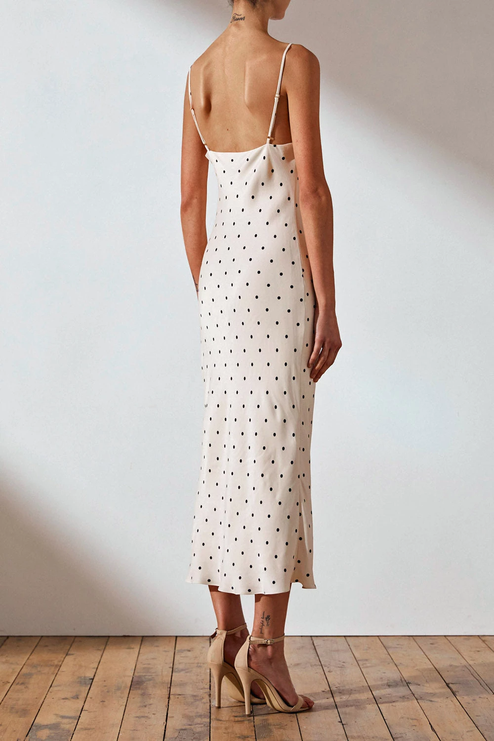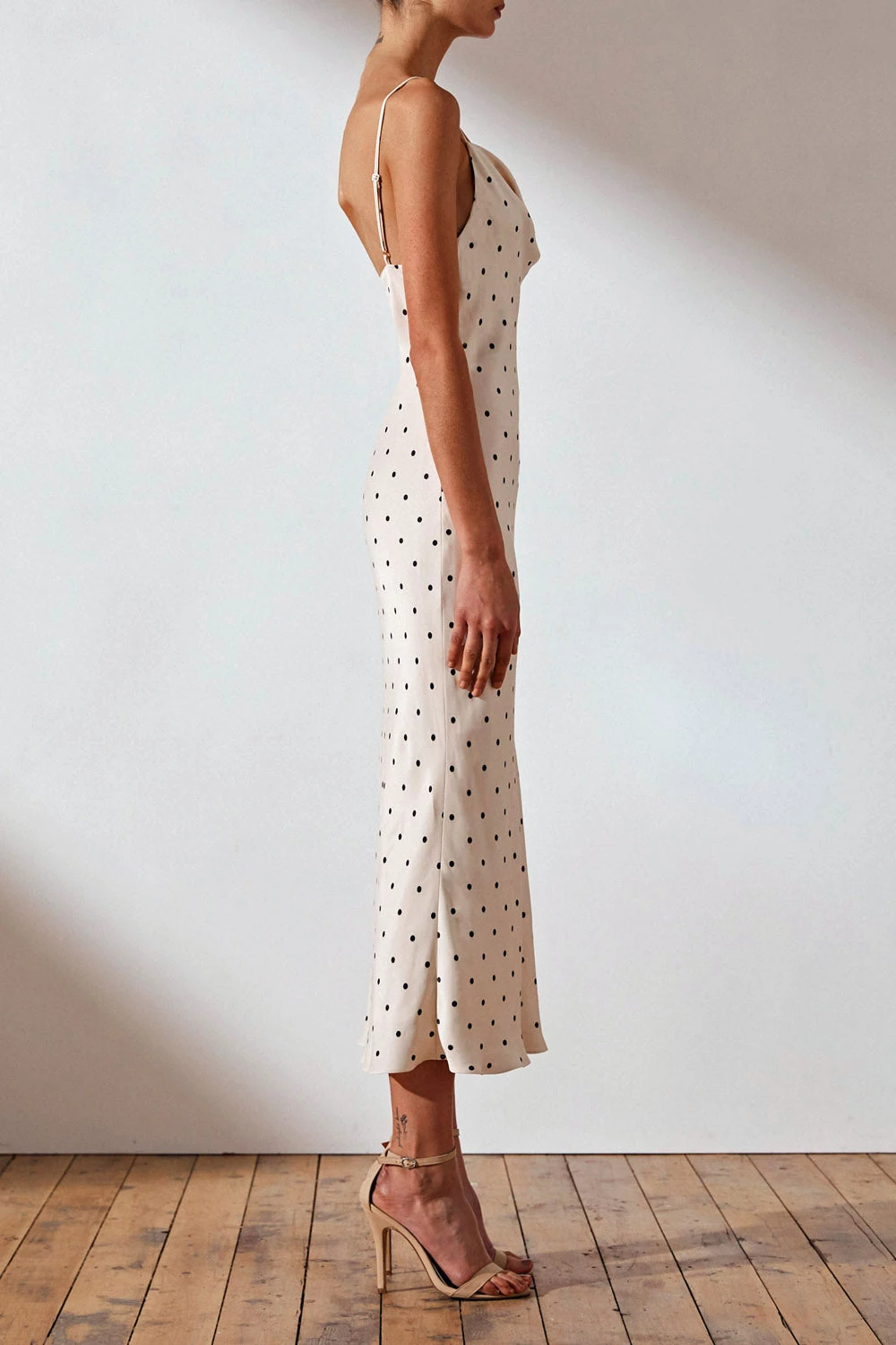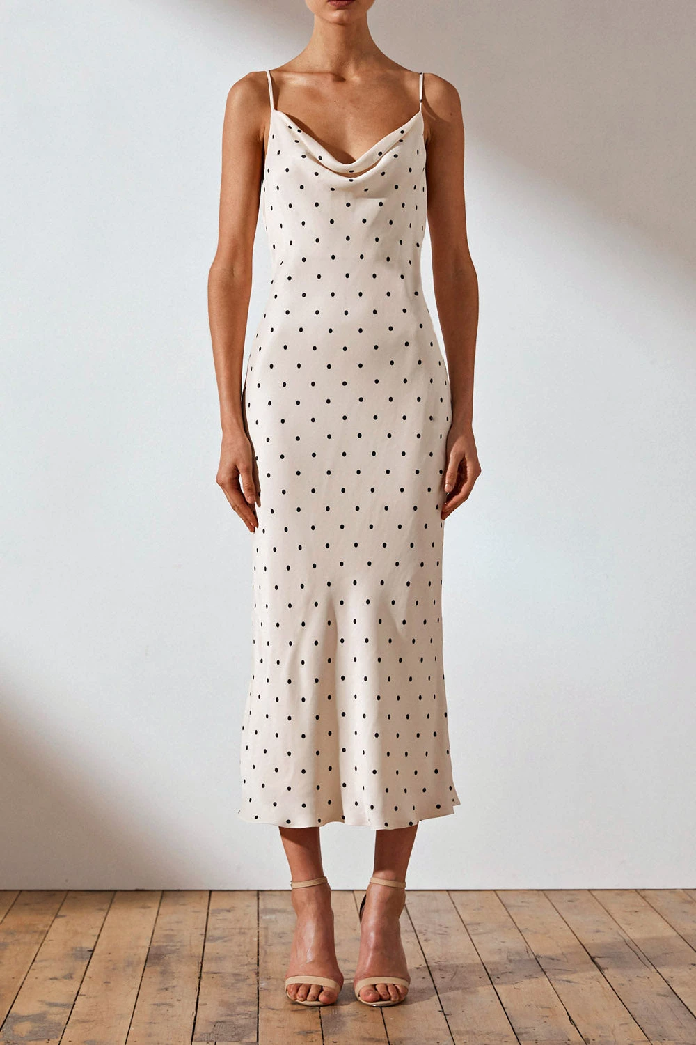 Bias cowl midi dress in the exclusive O’dell spot print in cream and black. This dress in a silk touch woven features a minimalistic slip on silhouette with adjustable spaghetti straps, cowl neckline, slight flare at hem and lining.