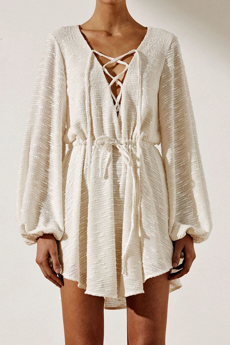 Ortiz Drawstring mini dress in a luxurious textured boucle knit. This dress in a creamy hue features a low v neckline, lace up front, long balloon sleeves with elasticated cuff, drawstring waist and full mini skirt with lining