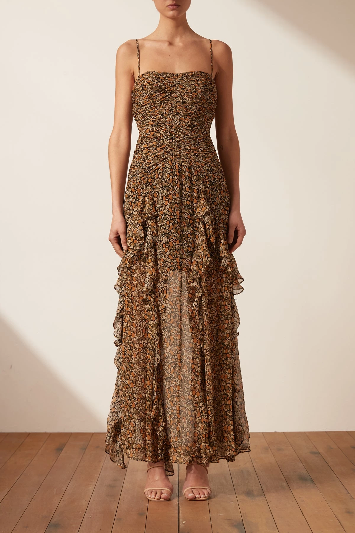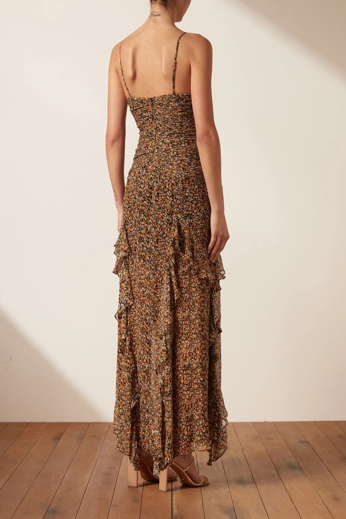 Strappy frill maxi dress in the exclusive Claudette print.