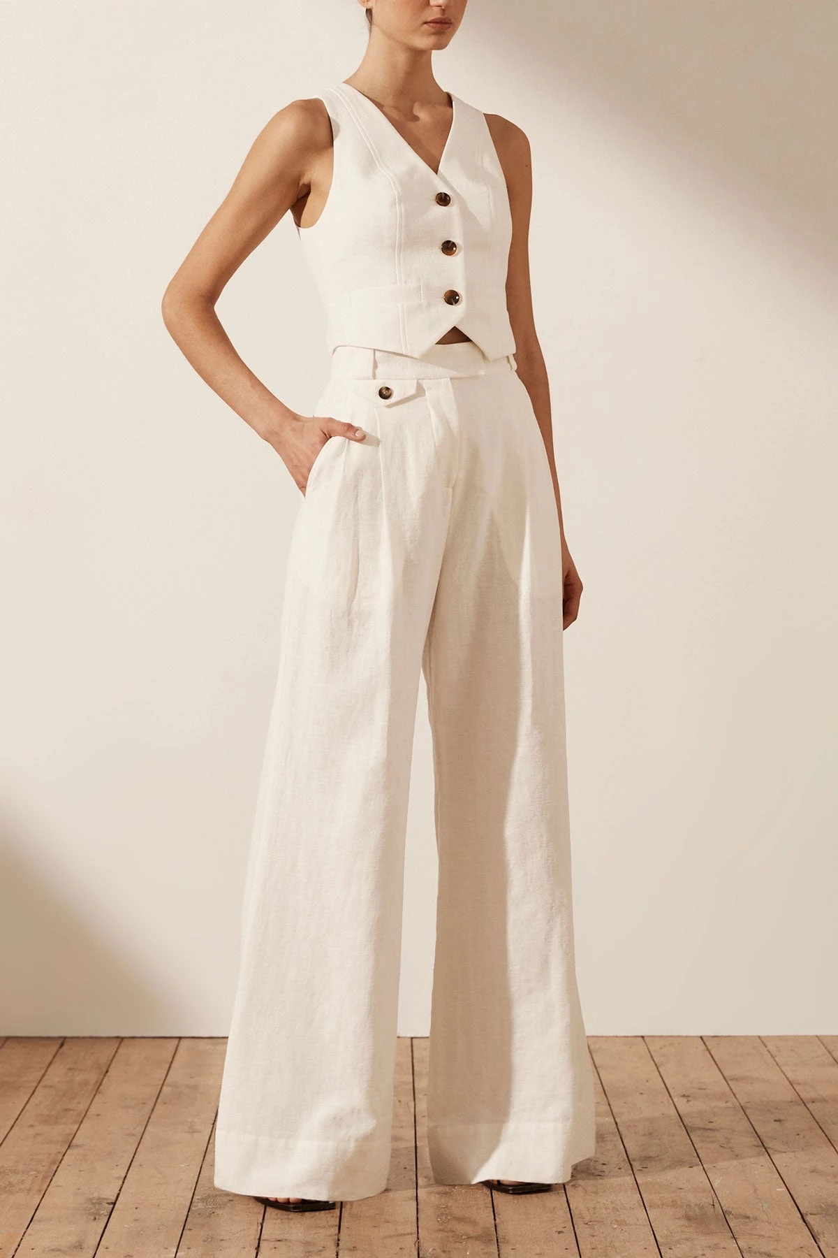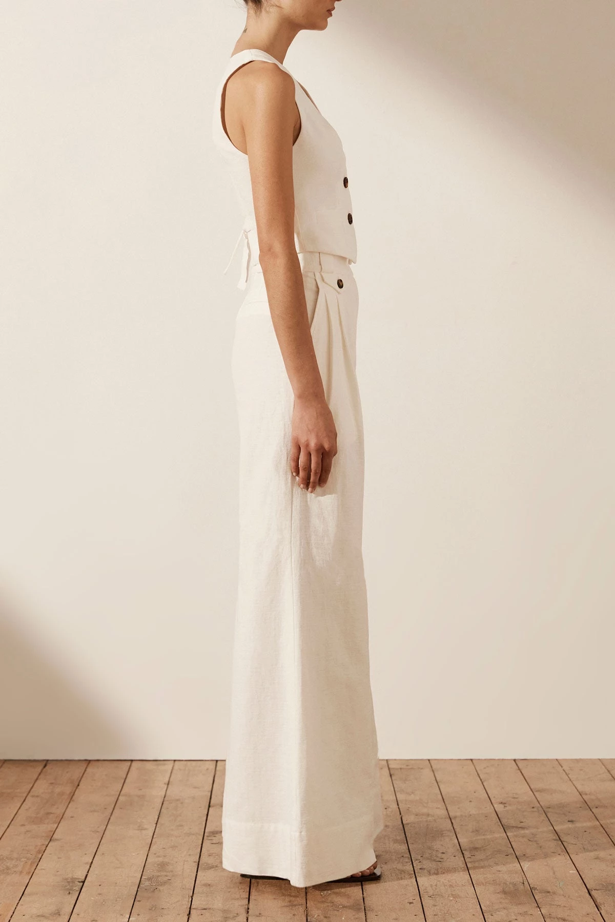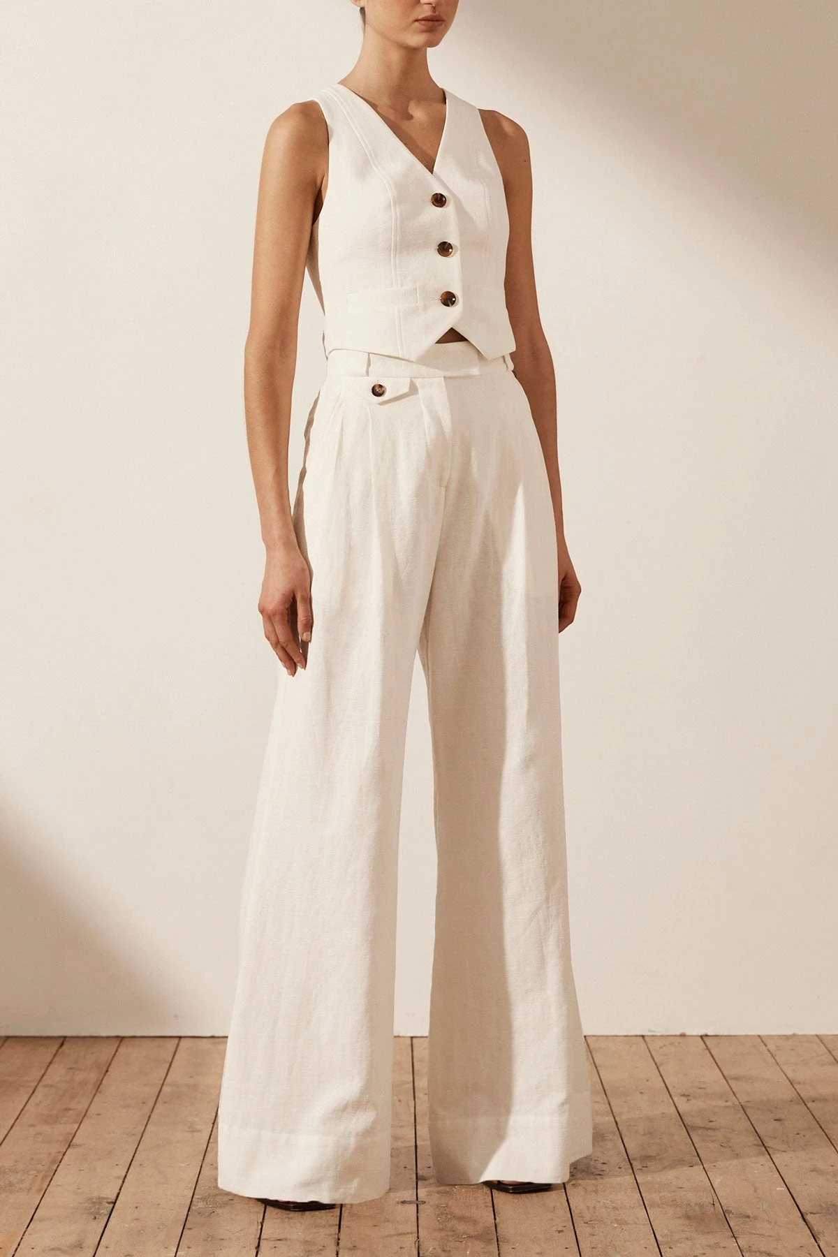 High waisted tailored pant in a premium cotton-linen blend.