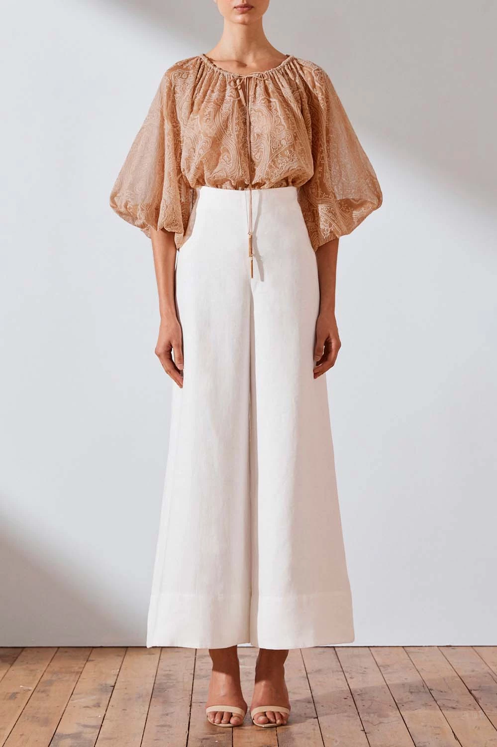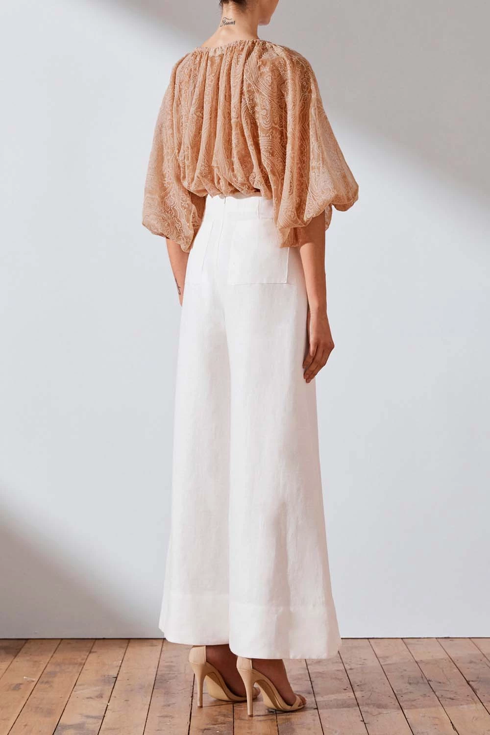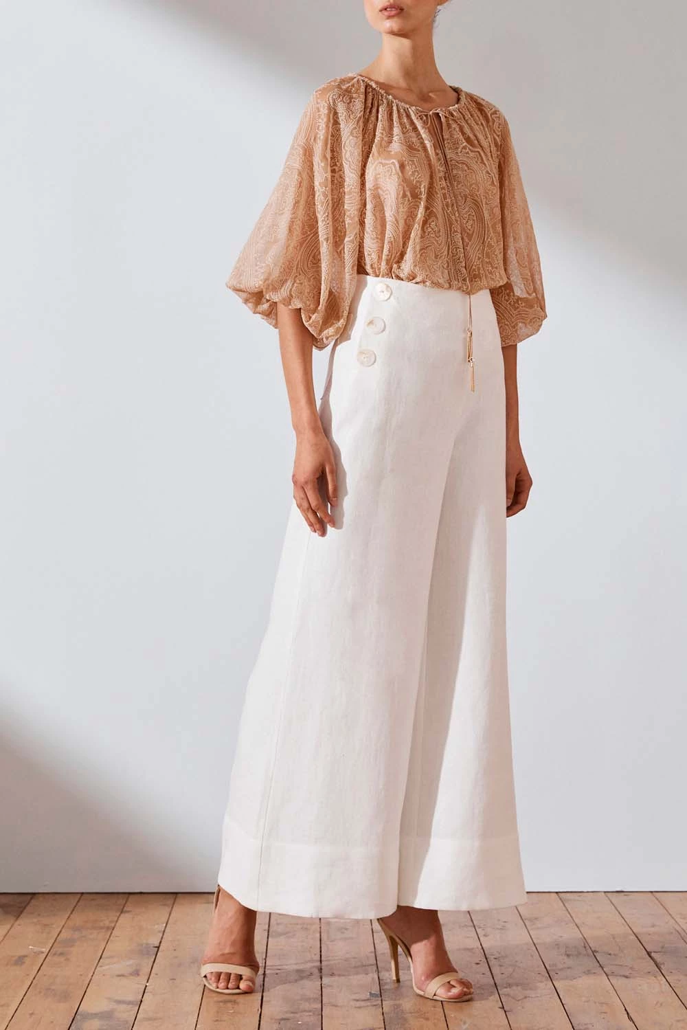 Sailor pant in a luxurious semi-sheer textured linen. This pant features high waistline, iridescent shell button opening at side waist, wide pant leg and lining