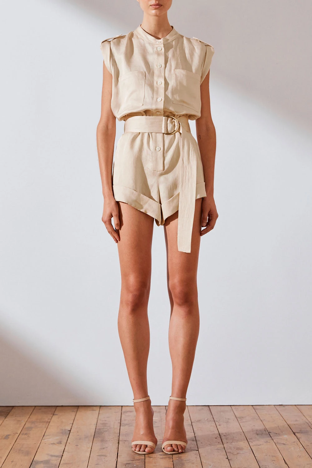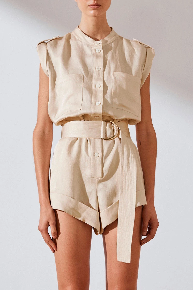 Boiler suit in a creamy hue in a luxurious linen blend. This playsuit features stand collar, front button tab, detachable top-stitched fabric belt with gold coloured ‘D’ ring buckle, 4 pocket design and turnover pant cuff.