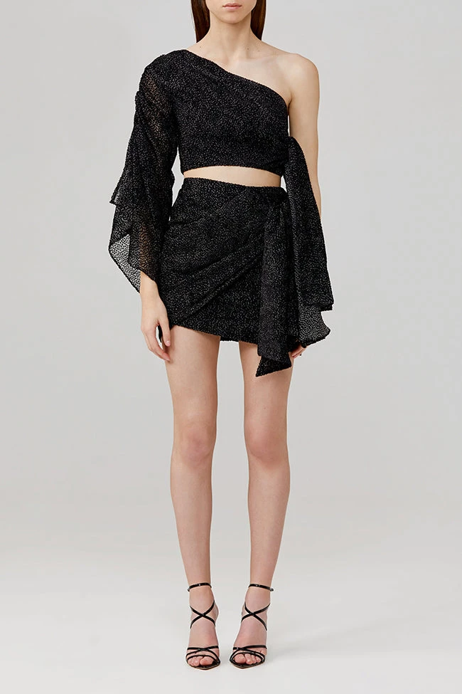 The one-shoulder Myla Top crafted in mixed polka fabrication features soft gathering detail. This top can be dressed down with jeans or worn with the Darcie Skirt (available here) for a more sophisticated look.